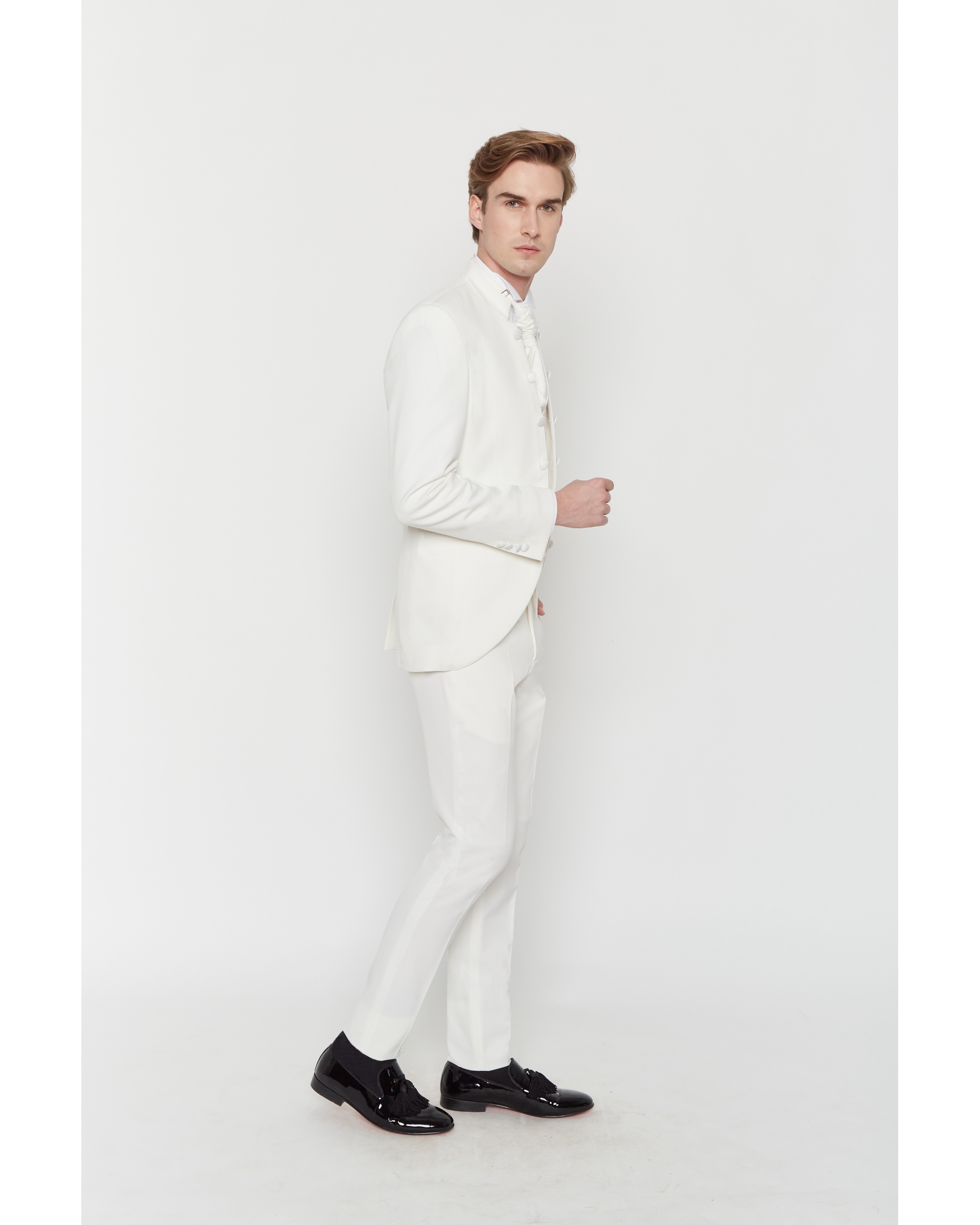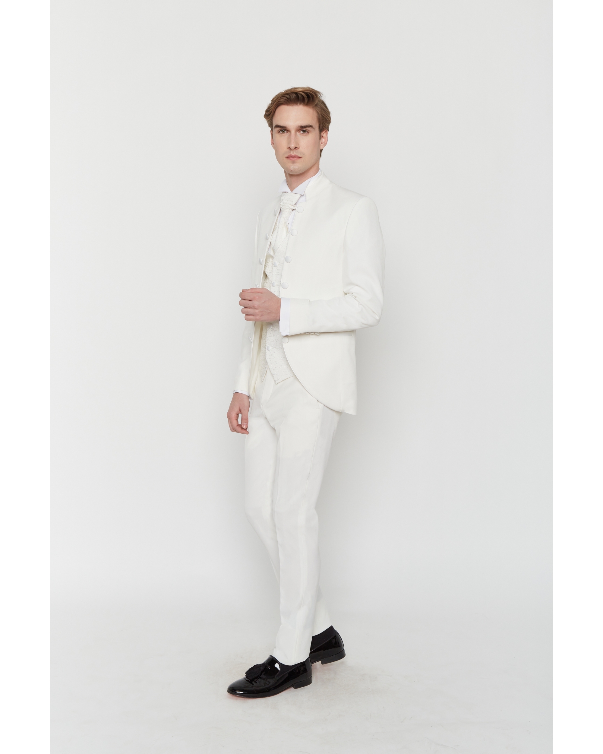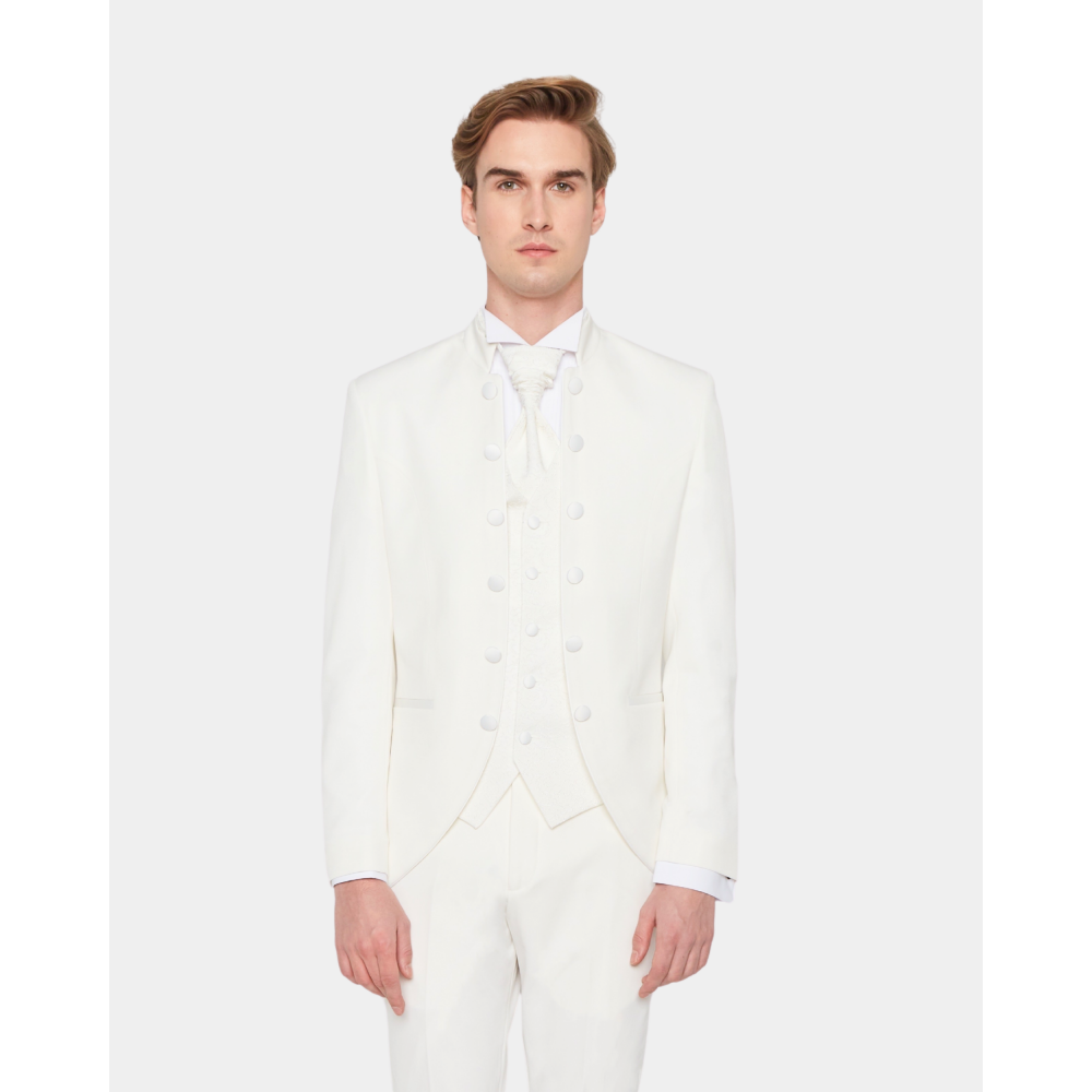 Costume de ceremonie.Veste col mao avec double boutonnage.Coupe slim,gilet et lavalliere brodé assorti