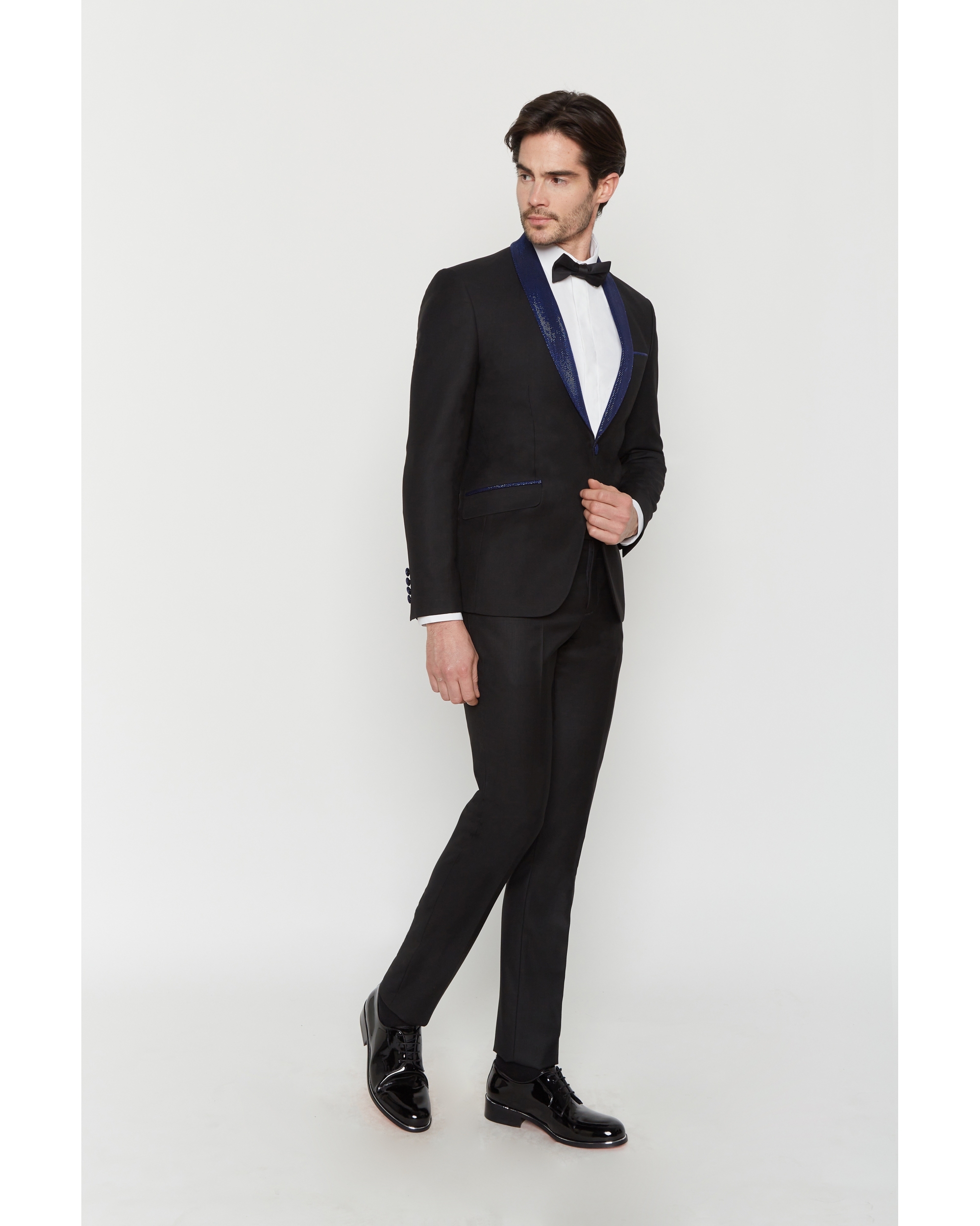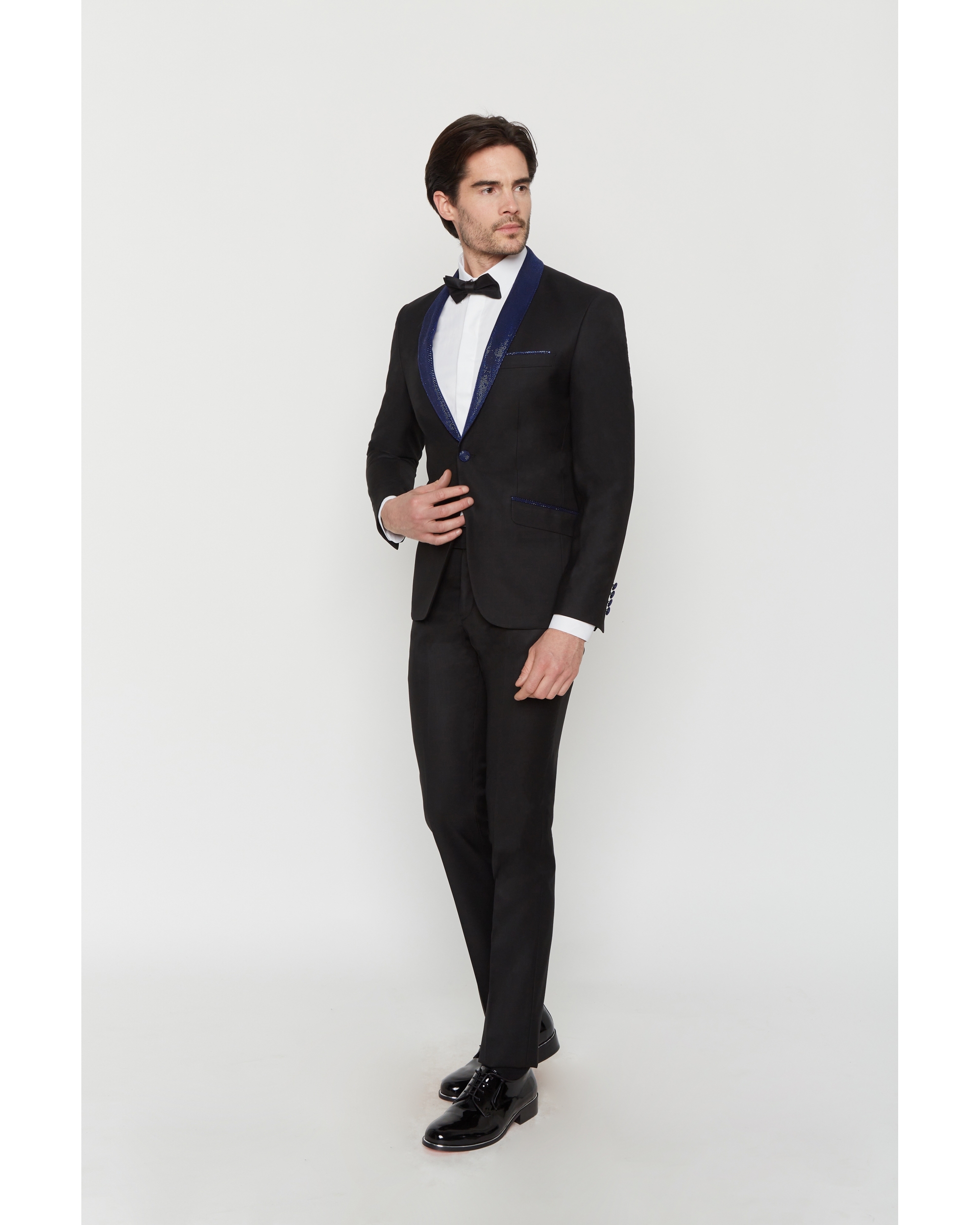 Ce smoking bi-color en laine mélangé comporte du Lycra pour un confort optimum. Avec une coupe ajustée cet ensemble se compose d’une veste à col chale en strass bleu 2 poches rabat et d’un pantalon zippé à 2 poches italienne.