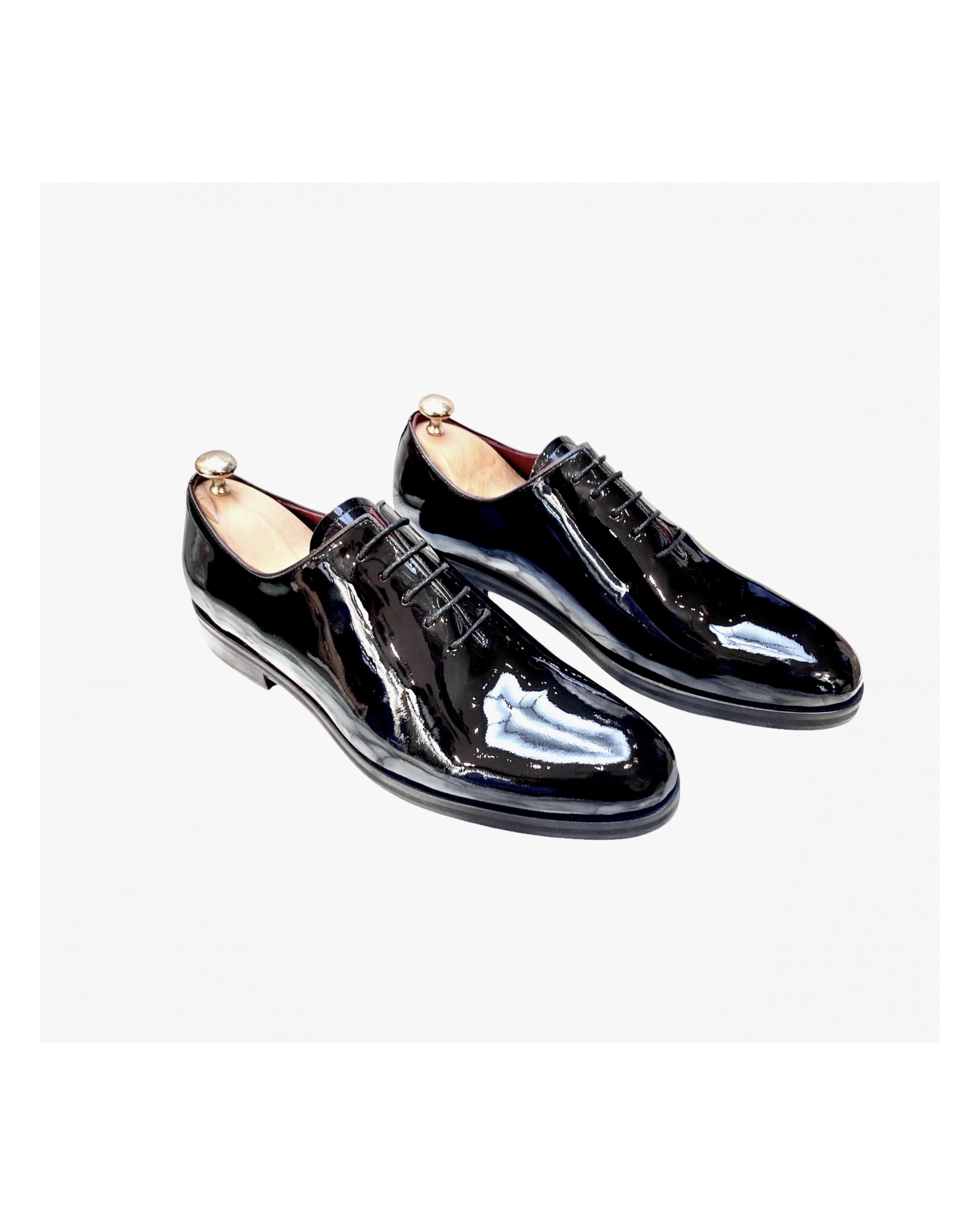 Réalisée en veau italien vernis d’un seul bloque sur semelle doublé en cuir, cousue main. Œillets invisibles et lacets ronds en coton cirés ton sur ton.