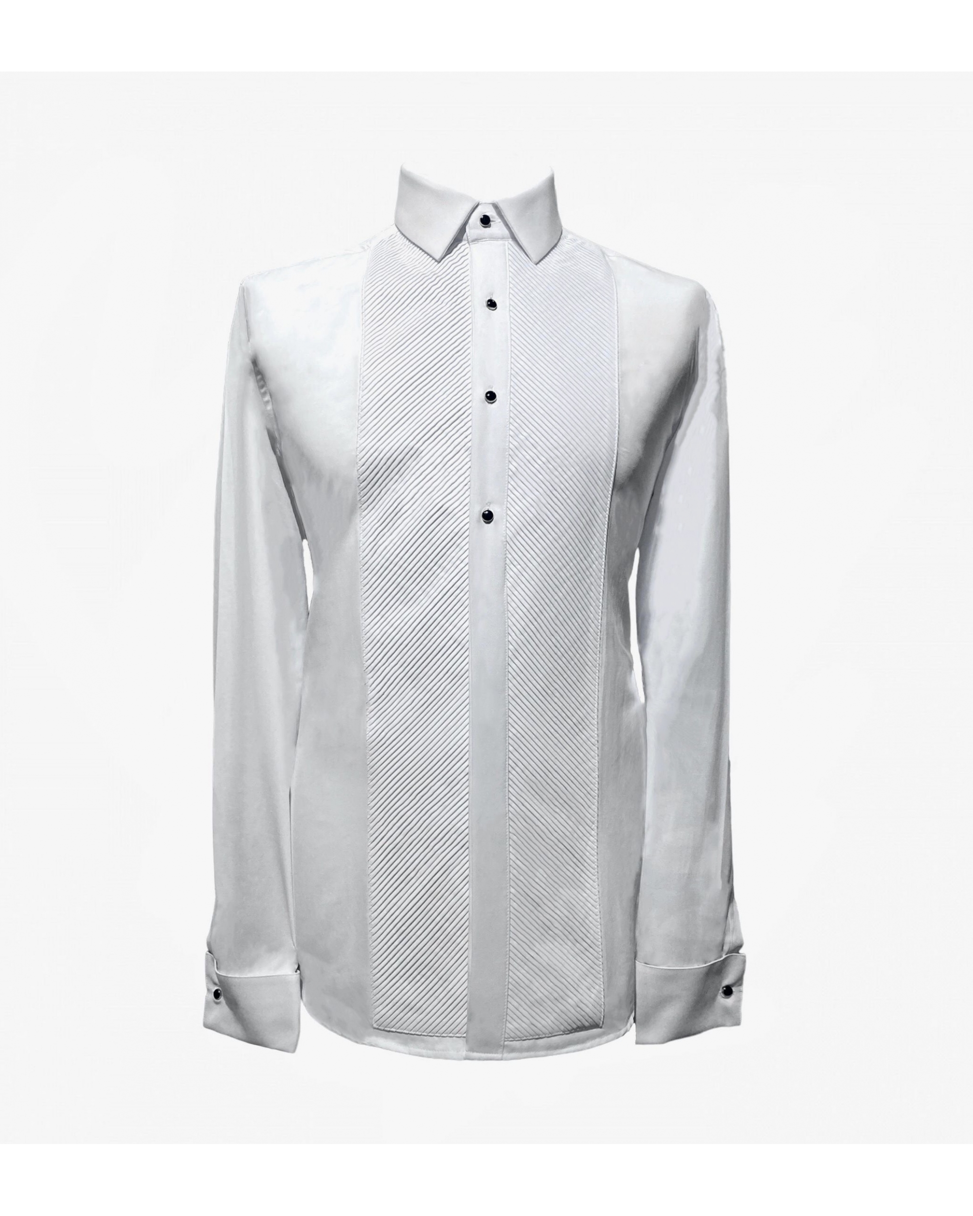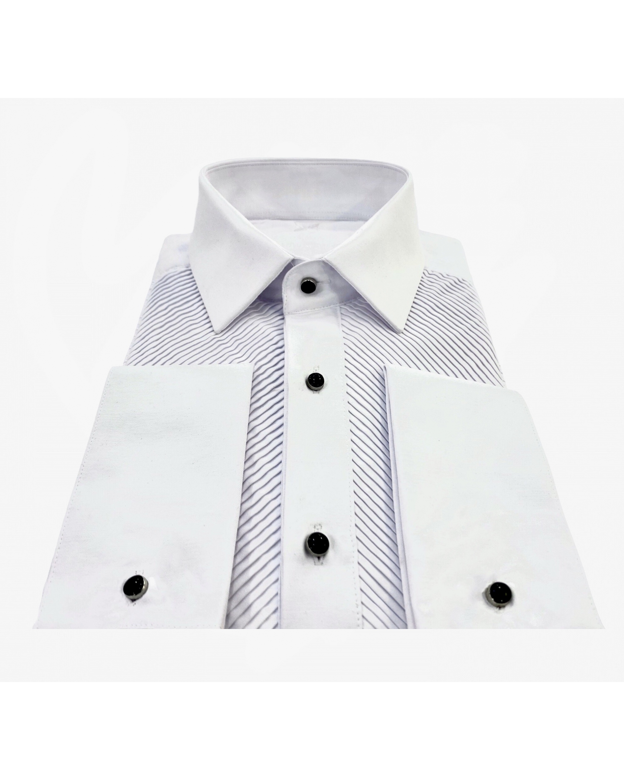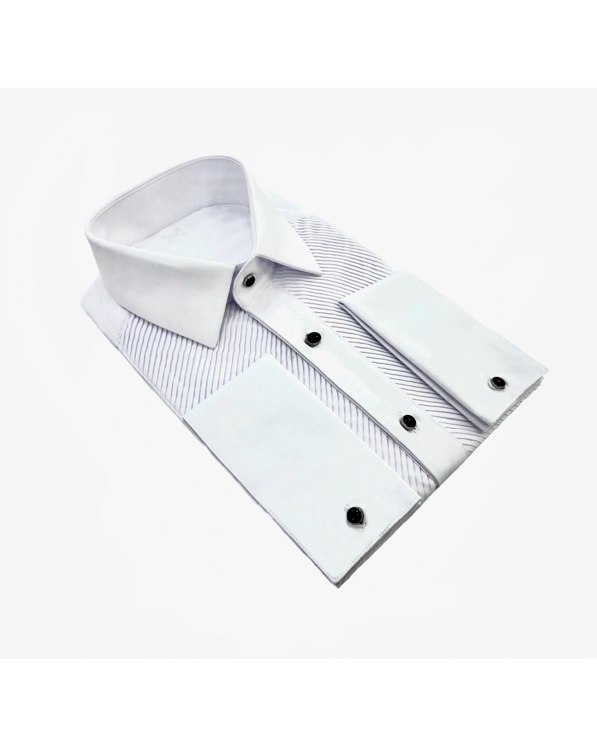 Cette chemise fabriquée dans un tissu "facile à repasser" vous donnera une élégance et un confort pour toute vos grandes occasions. Chemise col français avec plastron plissé et boutonnages à bouton métal noir apparent. Poignée mousquetaire avec bouton métal noir amovible
