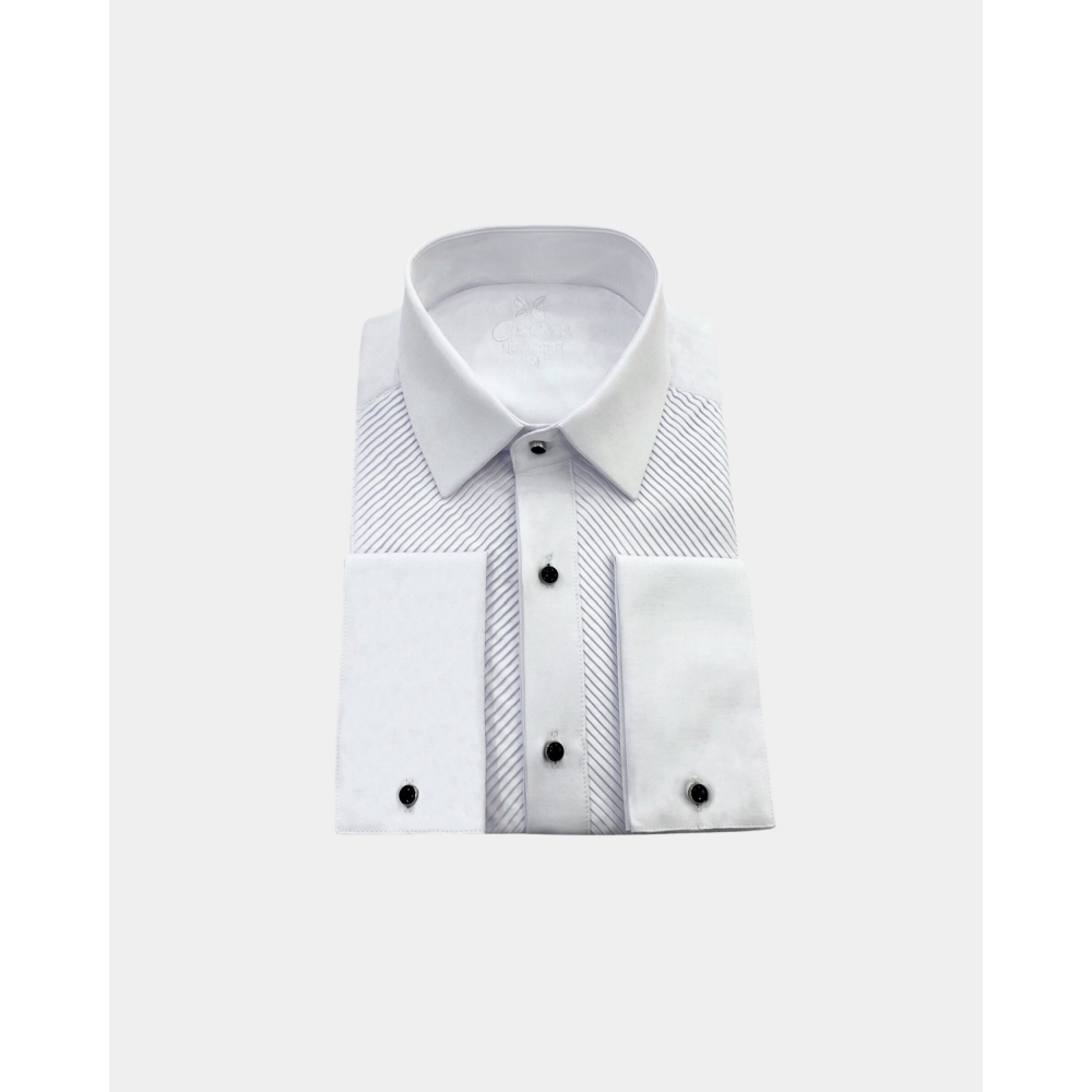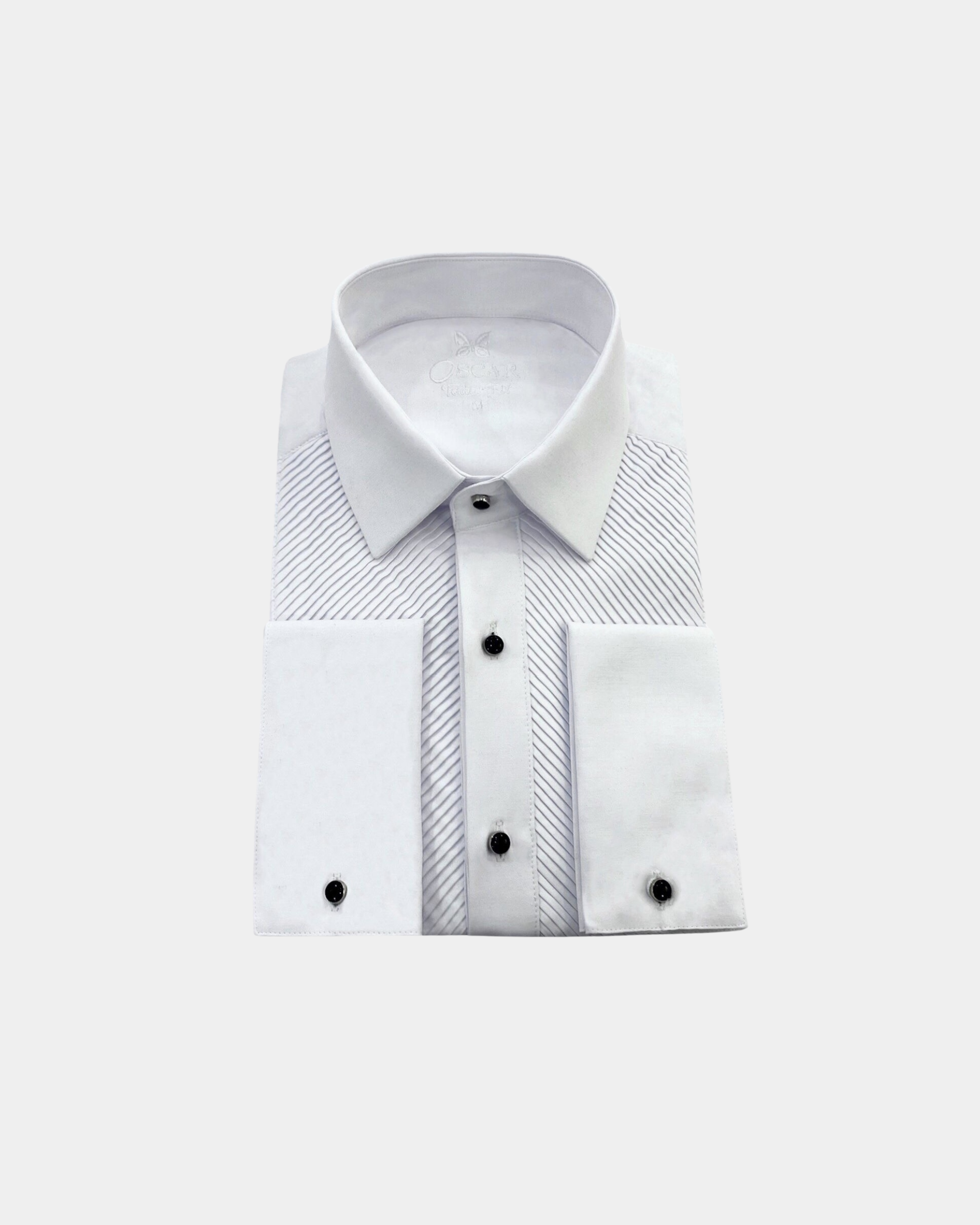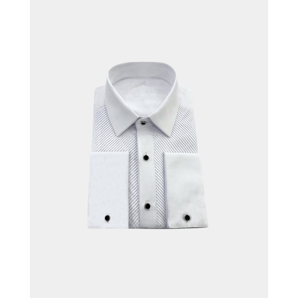 Cette chemise fabriquée dans un tissu "facile à repasser" vous donnera une élégance et un confort pour toute vos grandes occasions. Chemise col français avec plastron plissé et boutonnages à bouton métal noir apparent. Poignée mousquetaire avec bouton métal noir amovible