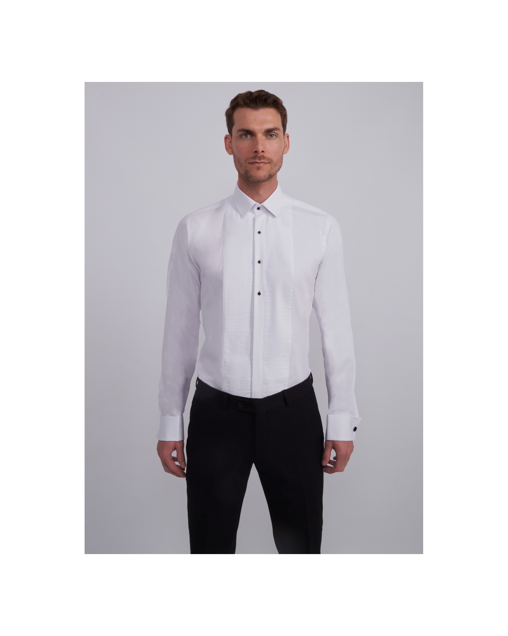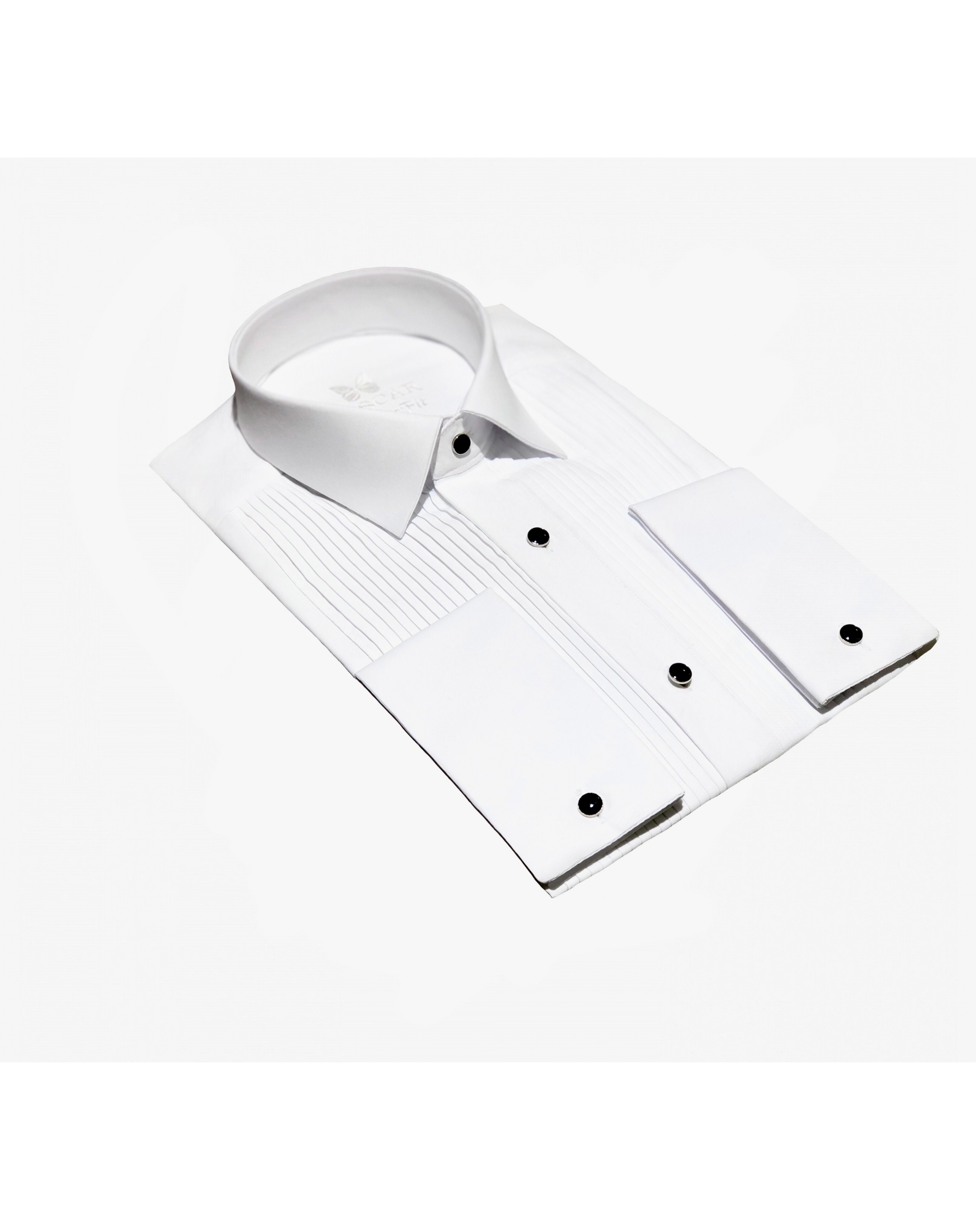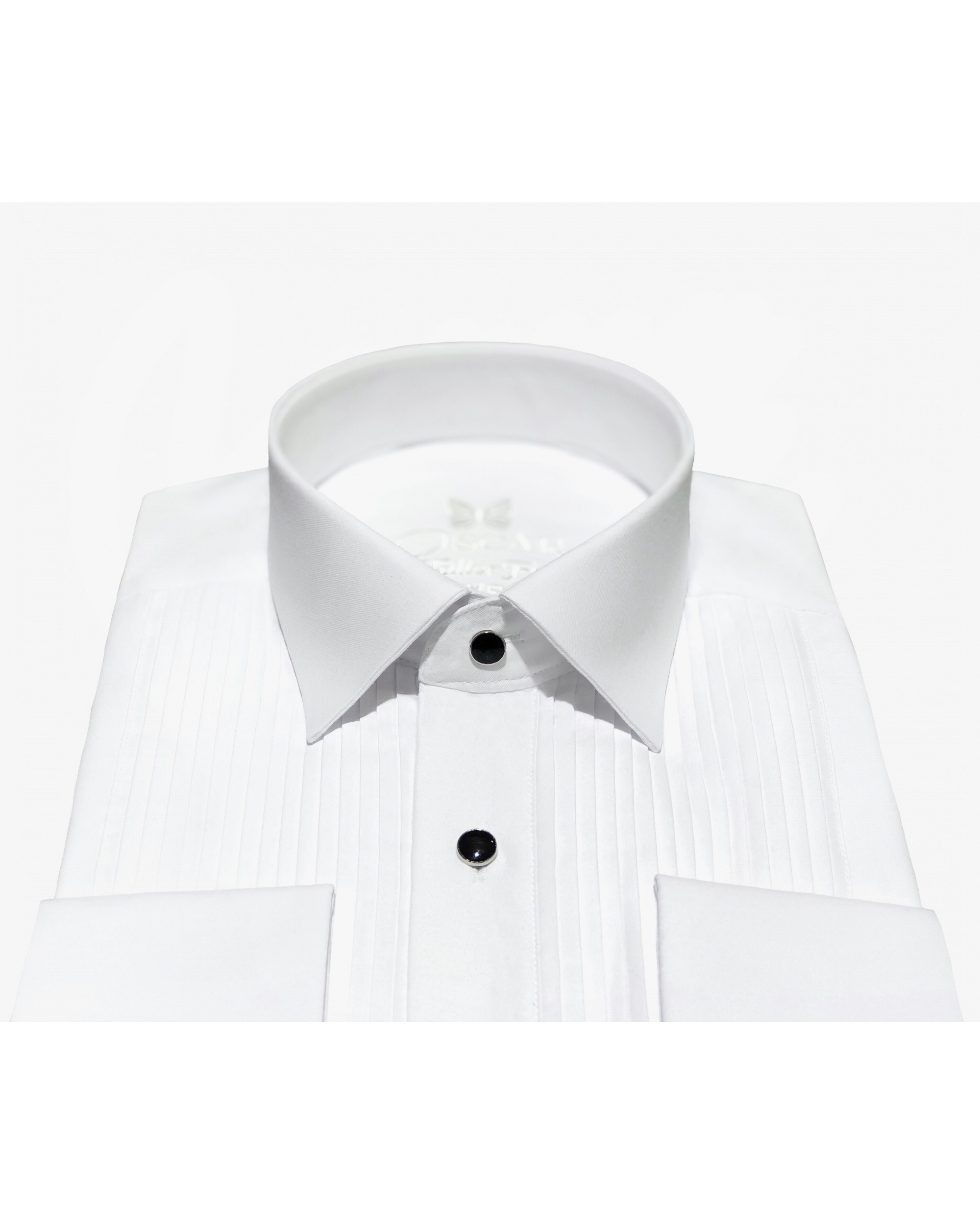 Cette chemise fabriquée dans un tissu "facile à repasser" vous donnera une élégance et un confort pour toute vos grandes occasions. Chemise col français avec plastron plissé et boutonnages à bouton métal noir apparent. Poignée mousquetaire avec bouton métal noir amovible.