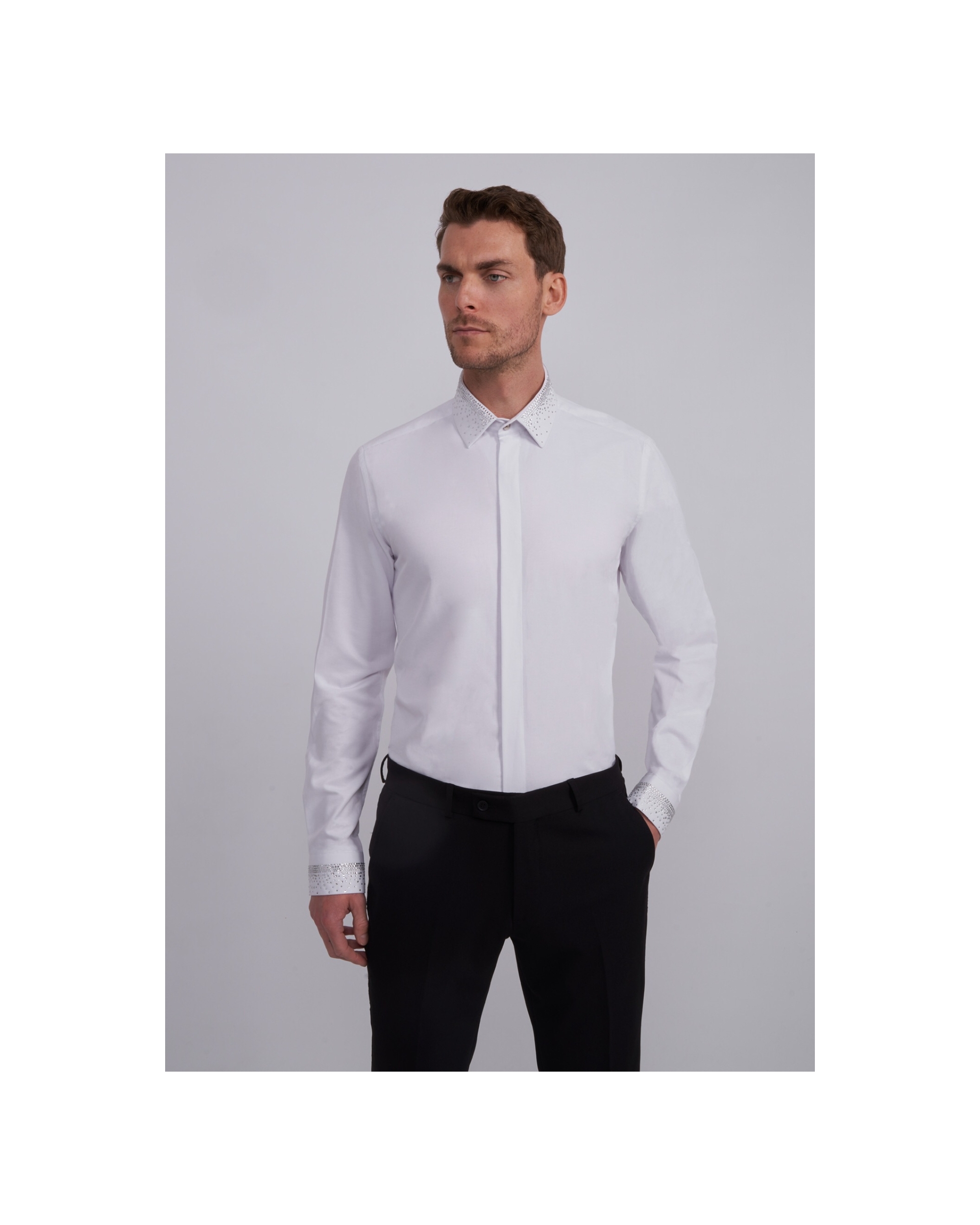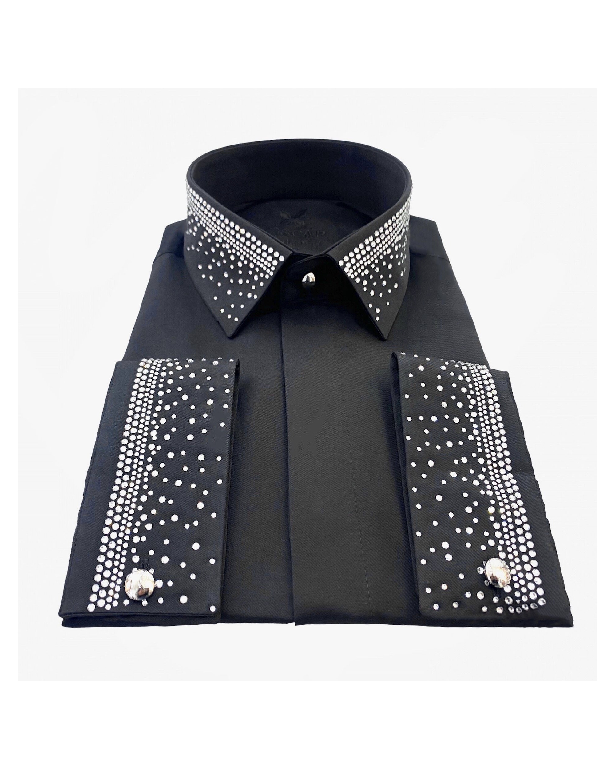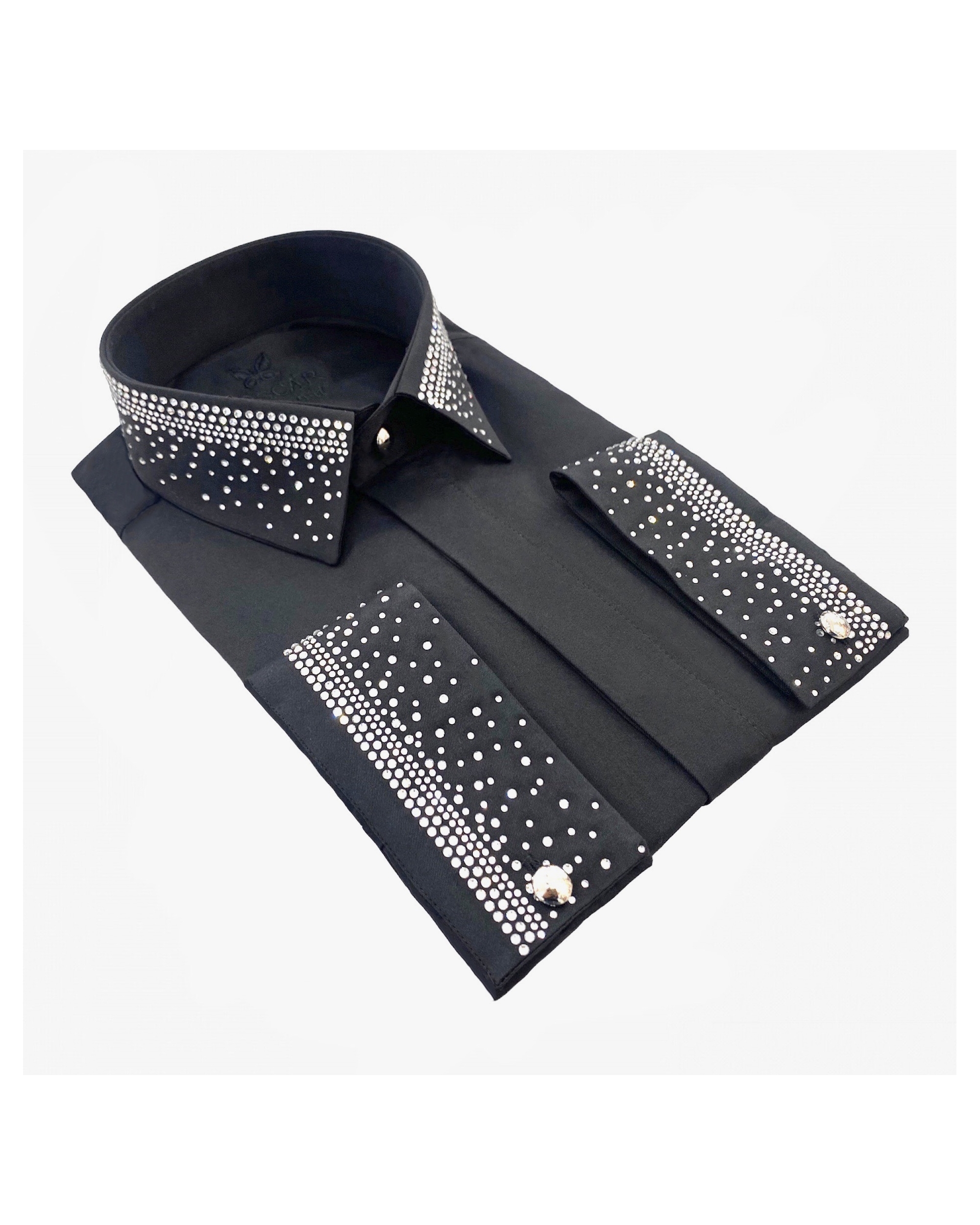 Cette chemise fabriquée dans un tissu "facile à repasser" vous donnera une élégance et un confort pour toute vos grandes occasions. Chemise col francais avec diamant et patte de boutonnages caché. Poignée mousquetaire avec strass et bouton métal argenté amovible