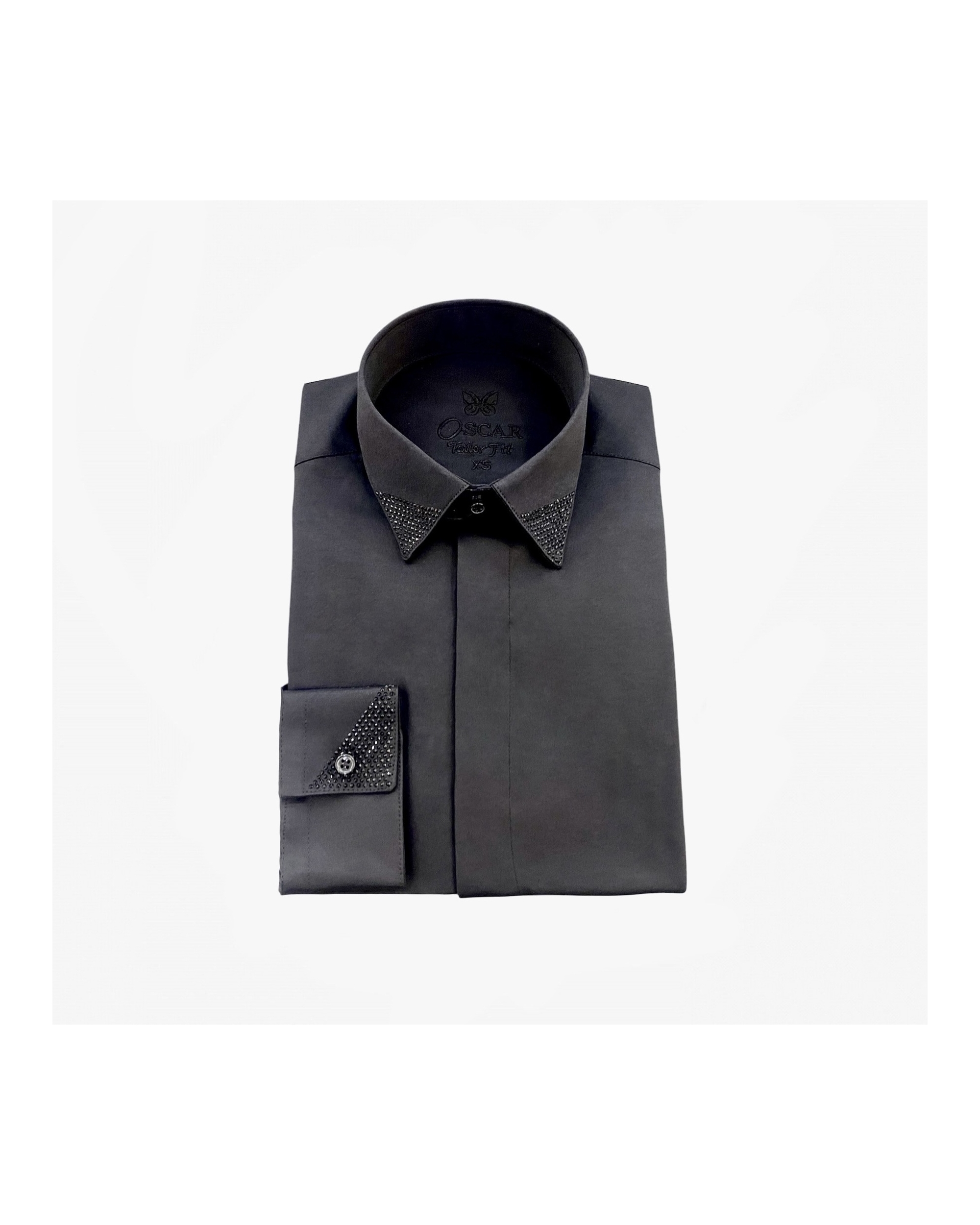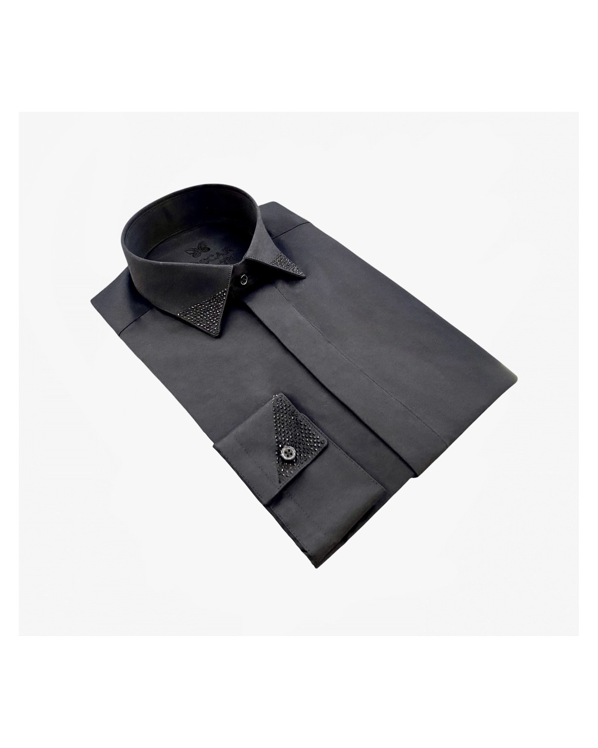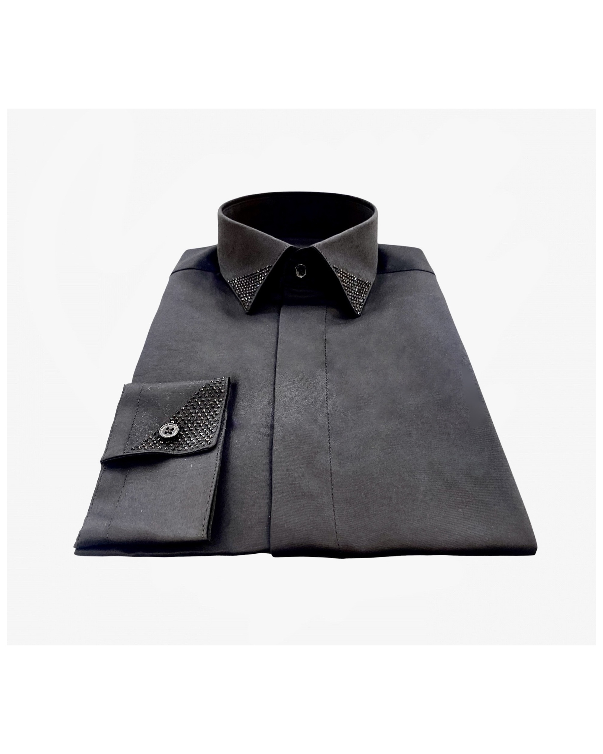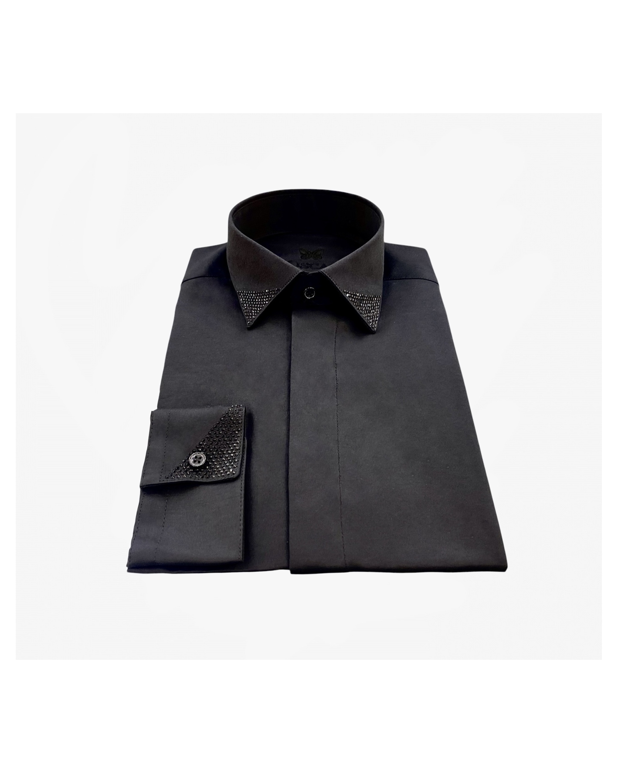 Cette chemise fabriquée dans un tissu "facile à repasser" vous donnera une élégance et un confort pour toute vos grandes occasions. Chemise col français sans couture apparente avec strass au col avec poignet mixte. Patte de boutonnage cachée.