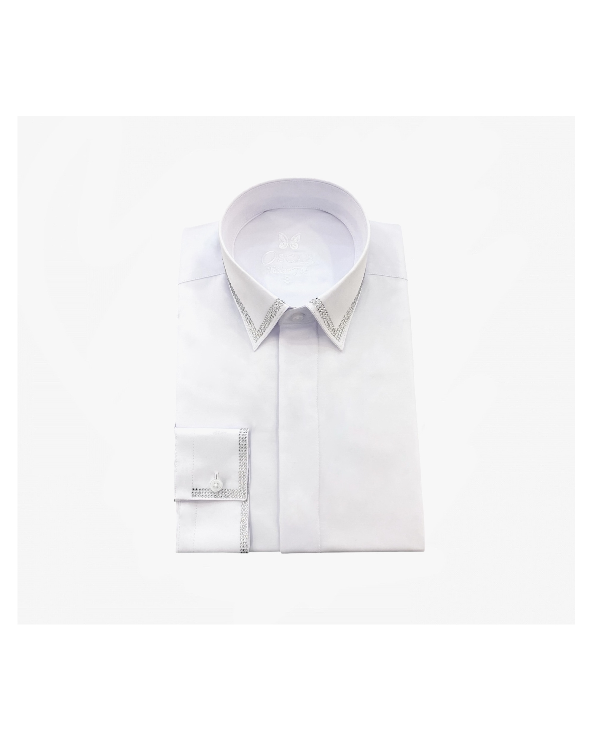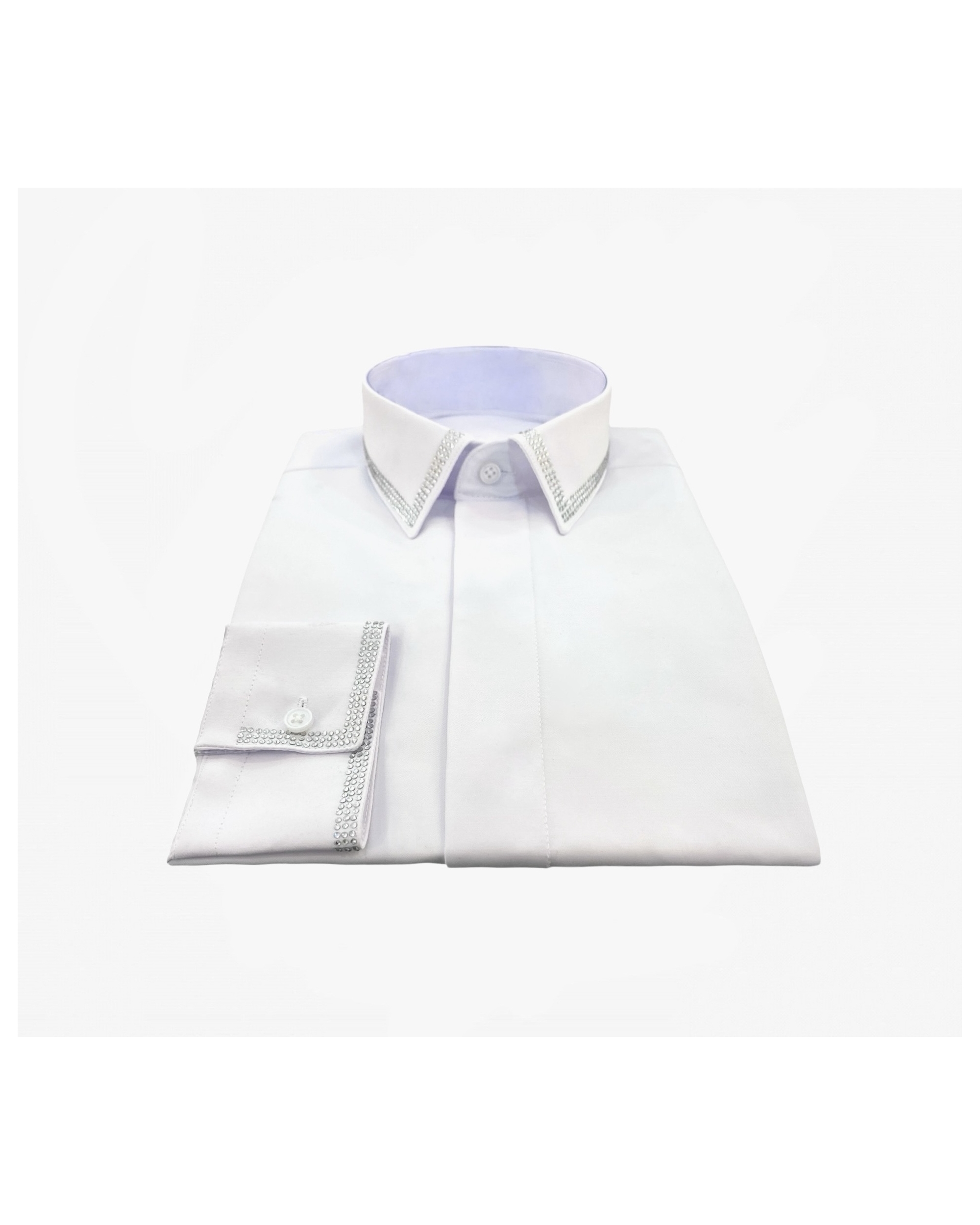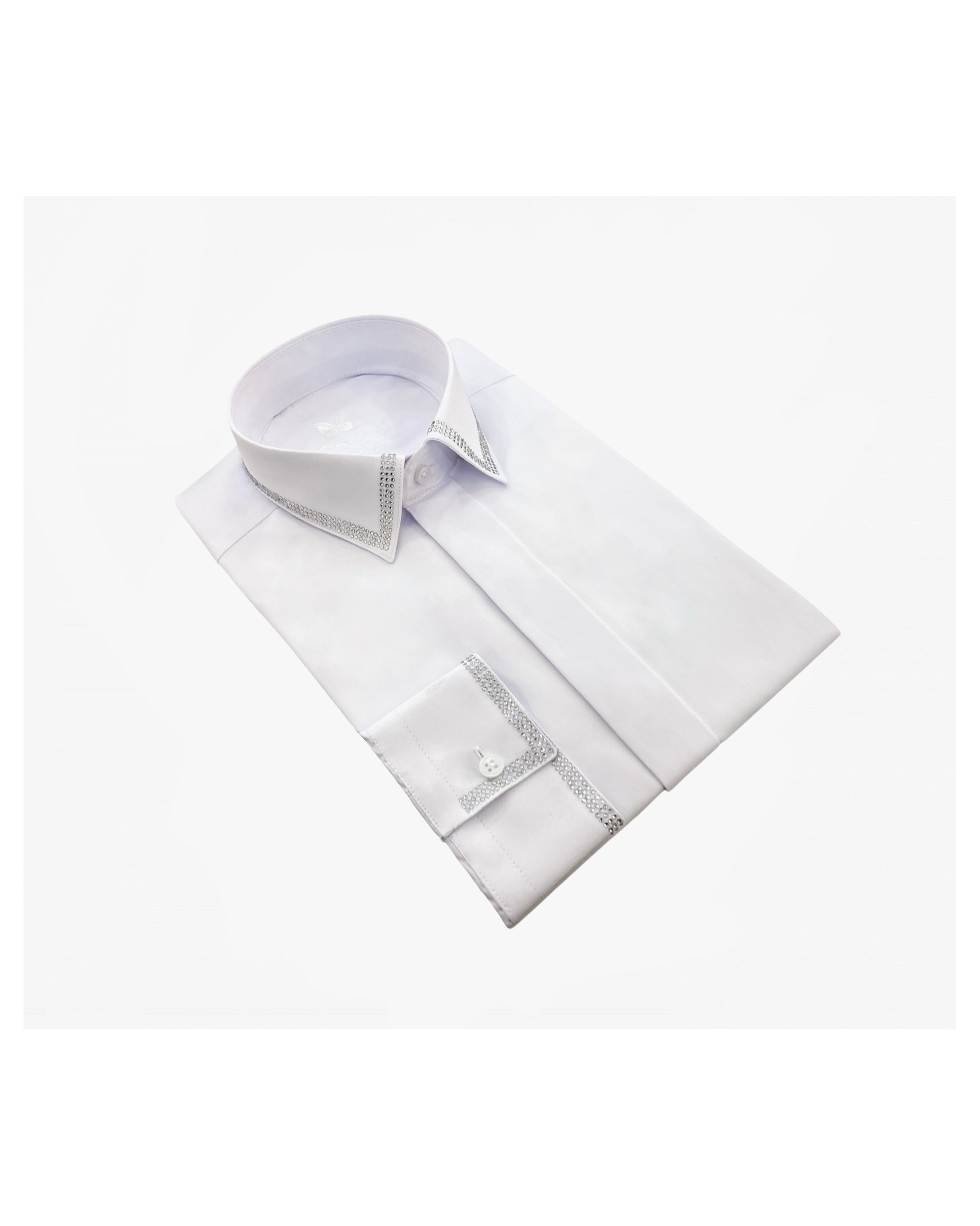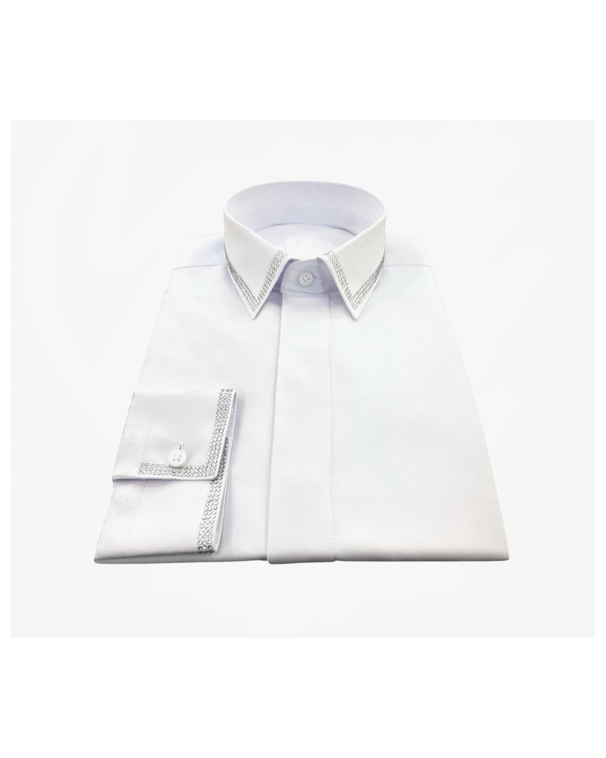 Cette chemise fabriquée dans un tissu "facile à repasser" vous donnera une élégance et un confort pour toute vos grandes occasions. Chemise col français sans couture apparente avec strass au col avec poignet mixte. Patte de boutonnage cachée.