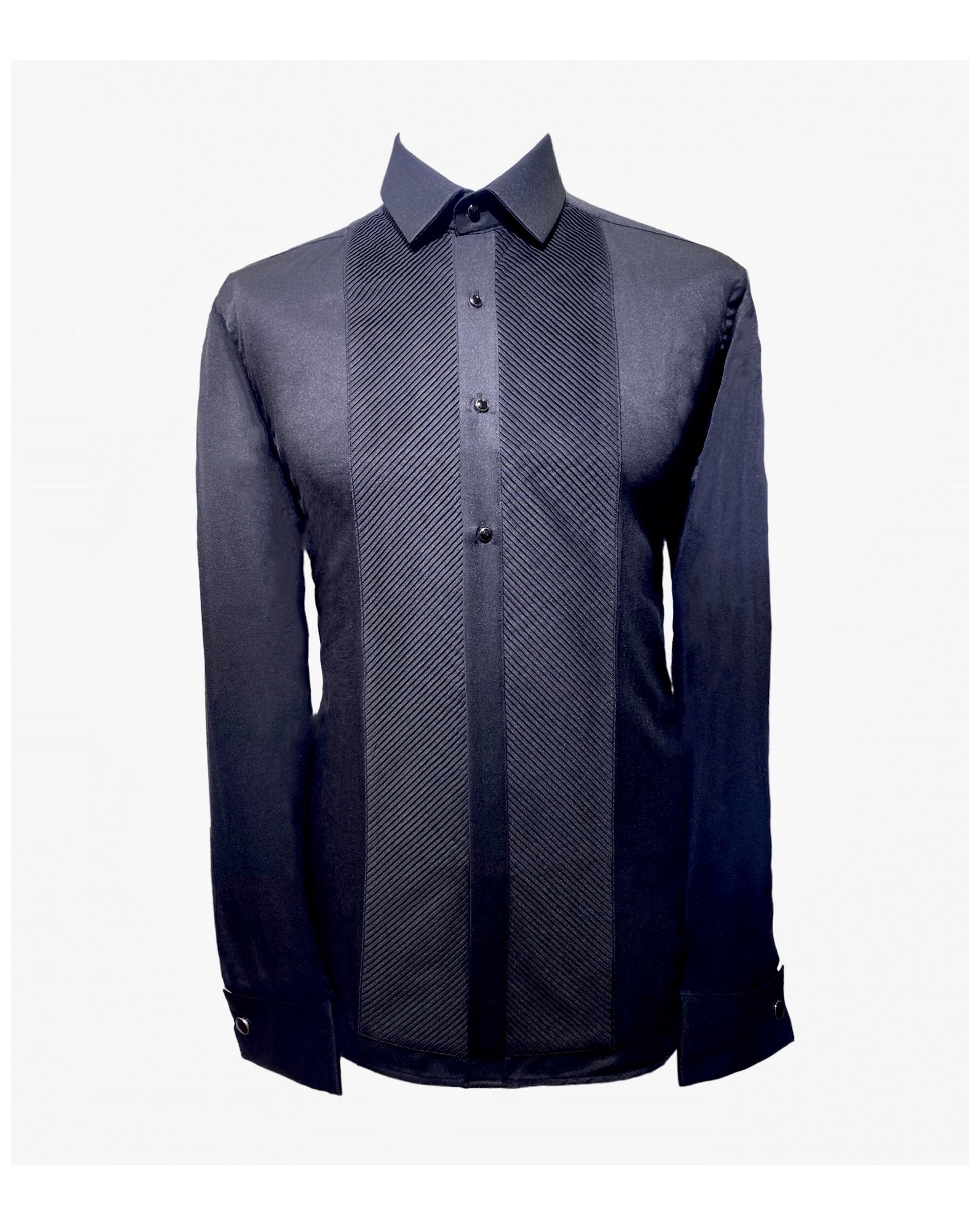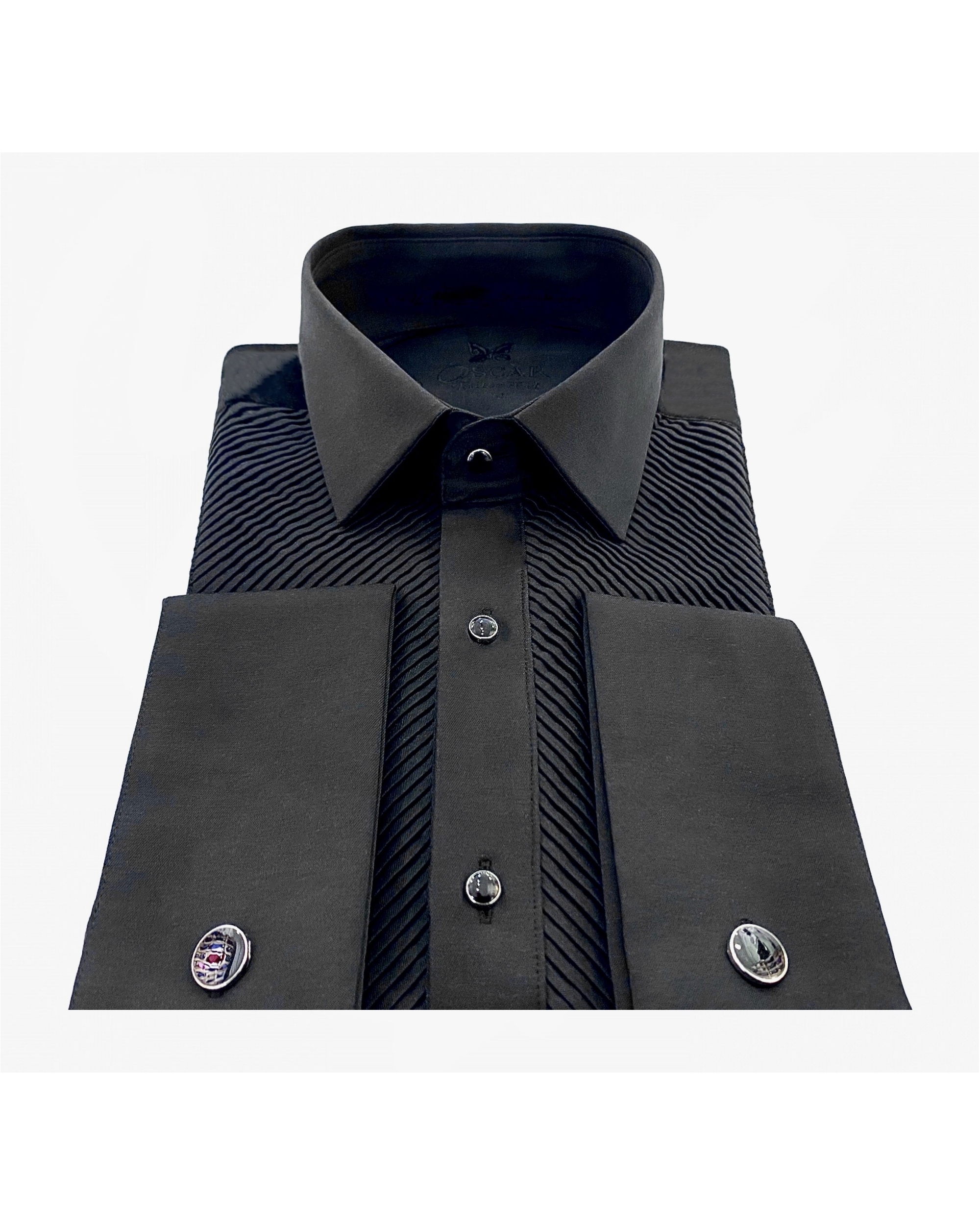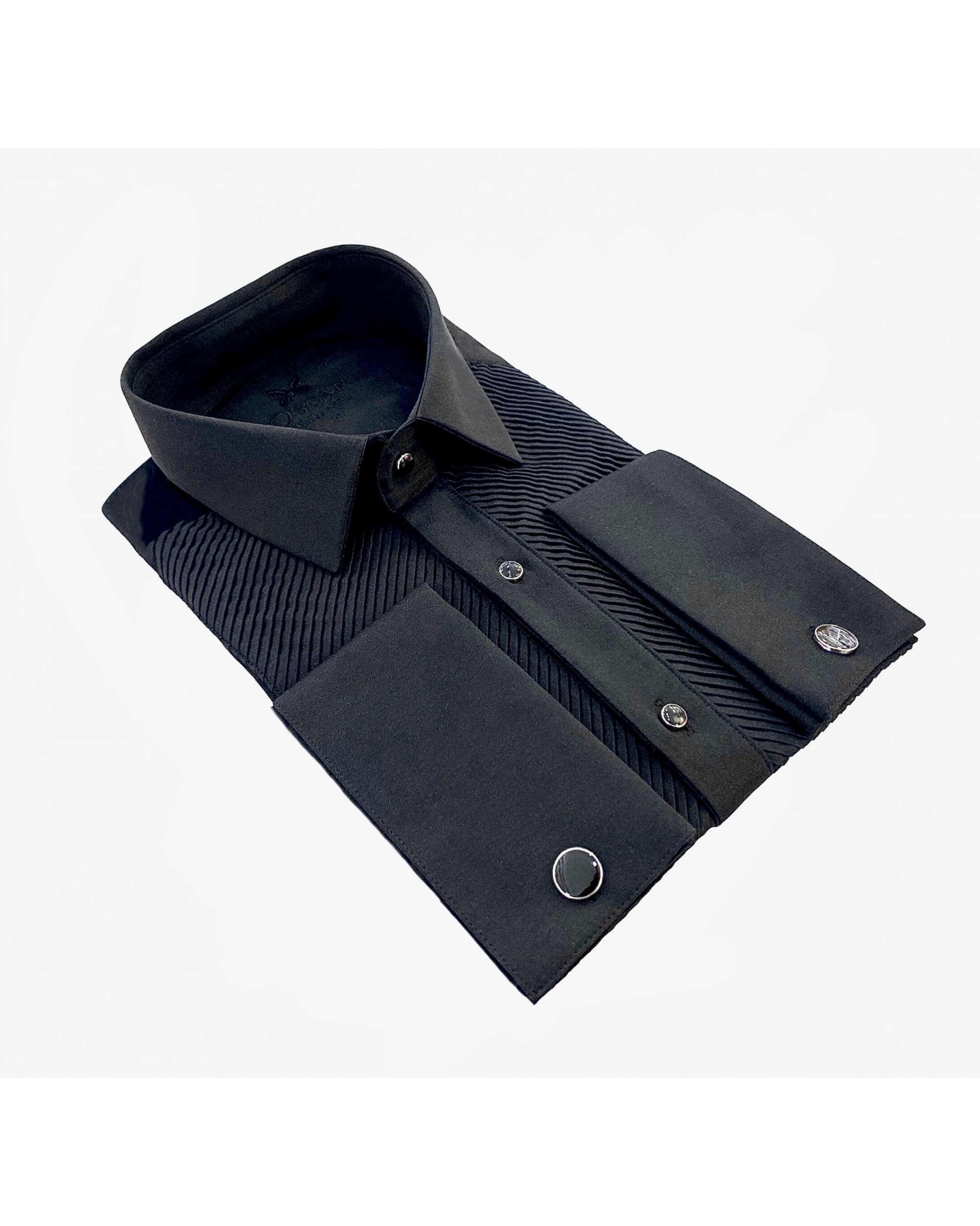 Cette chemise fabriquée dans un tissu "facile à repasser" vous donnera une élégance et un confort pour toute vos grandes occasions. Chemise col français avec plastron plissé et boutonnages à bouton métal noir apparent. Poignée mousquetaire avec bouton métal noir amovible