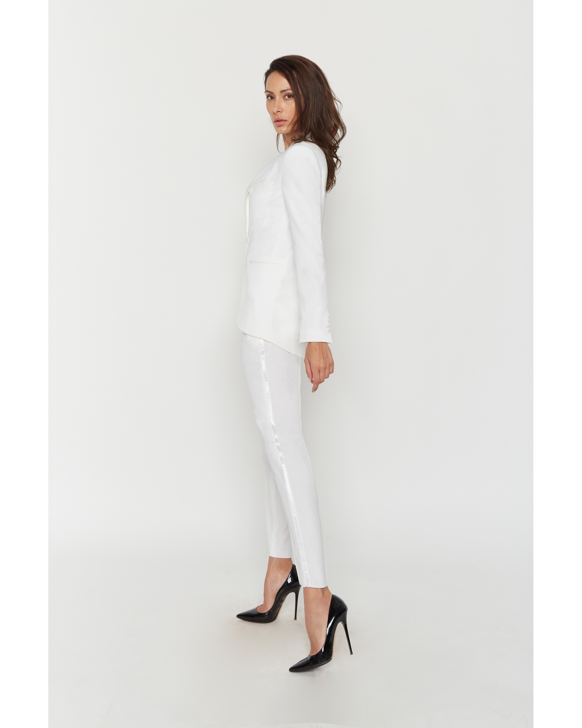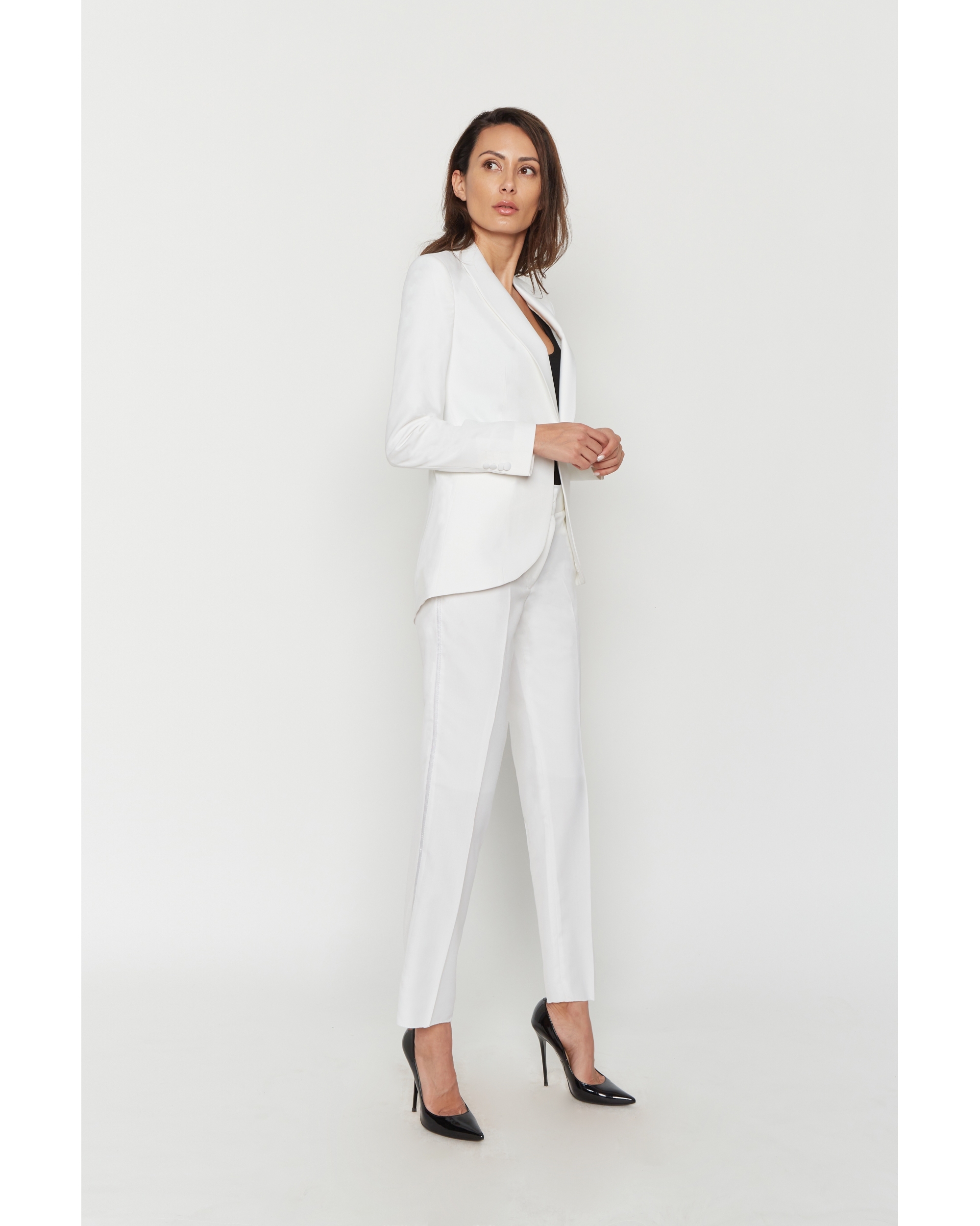 Ensemble smoking composé d une veste , col chale satinée,poches passepoilées,boutons recouverts,légèrement plus longue derrière,et d un pantalon droit, jambes plutot larges. Bande satinée sur le coté.
