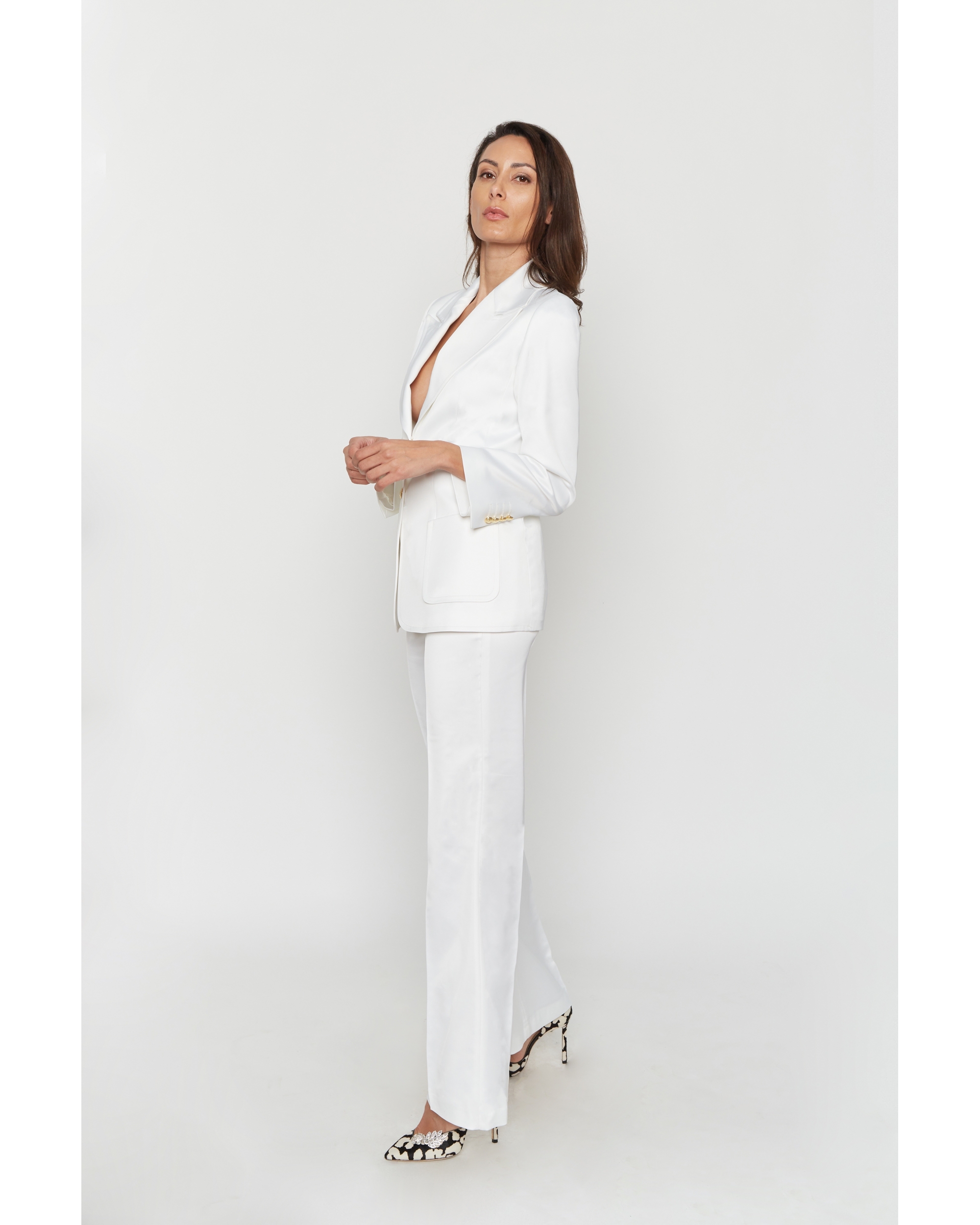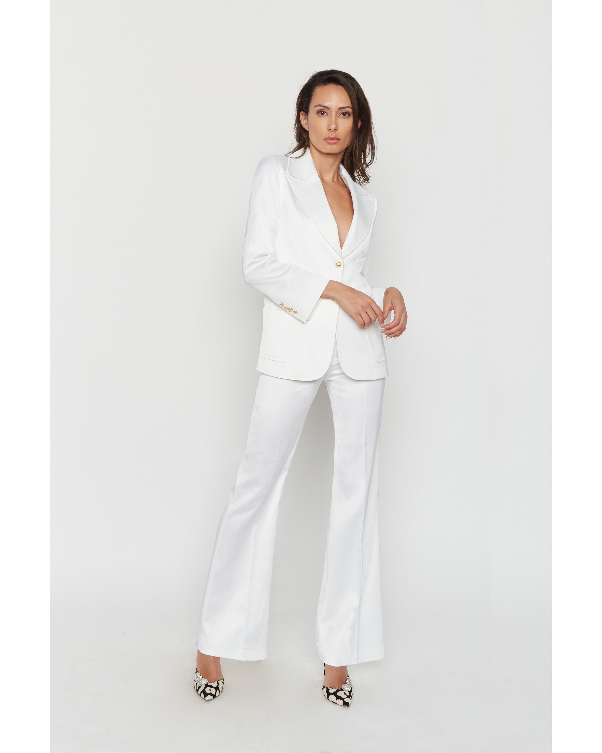 Ensemble satin composé de la veste Rachel à large col inspirées des seventies,2 poches plaquées,boutons dorés.Le Pantalon Vanessa est taille haute et jambes larges.