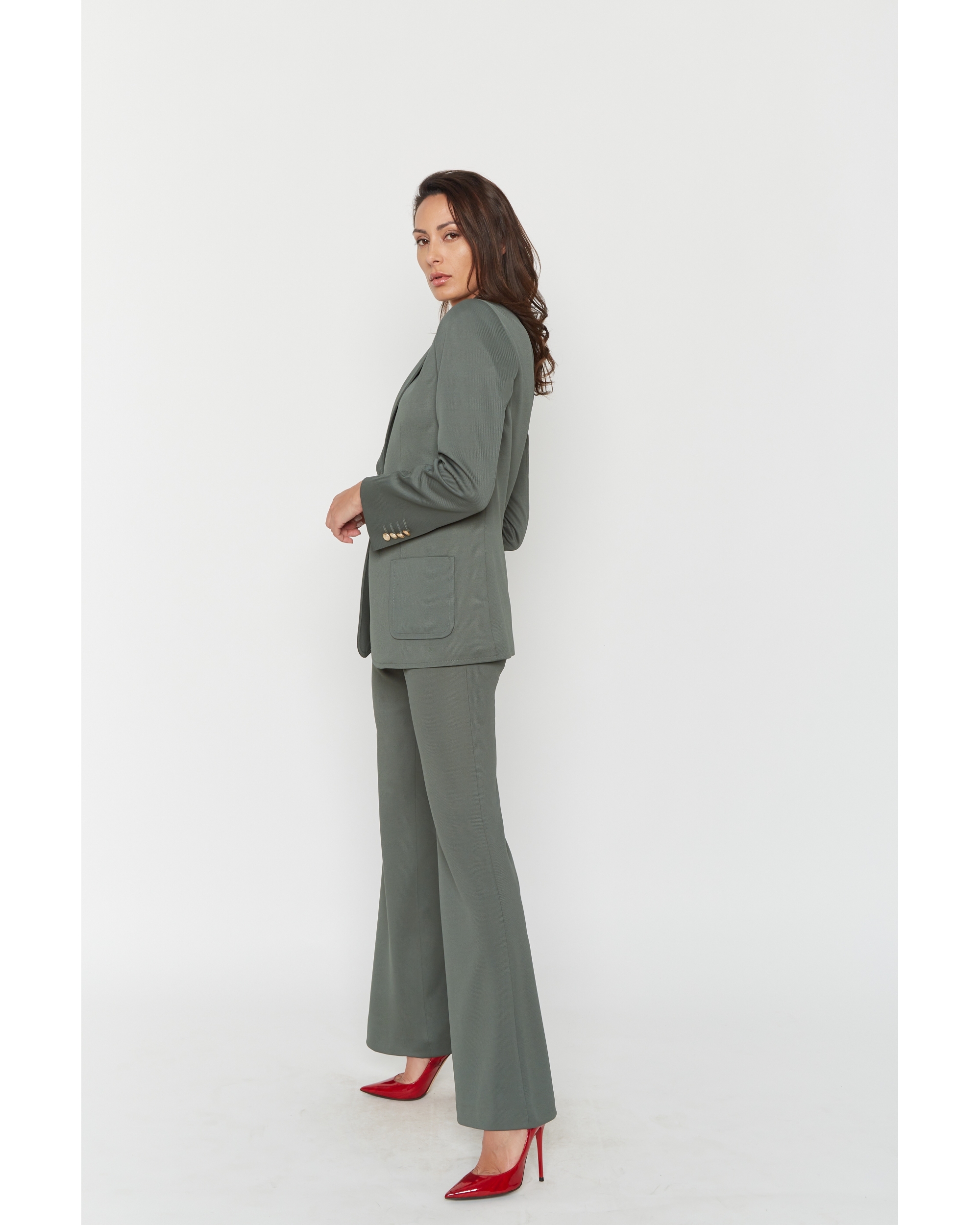 Ensemble composé de la veste Rachel à large col inspirées des seventies,2 poches plaquées,boutons dorés.Le Pantalon Vanessa est  taille haute et jambes larges.