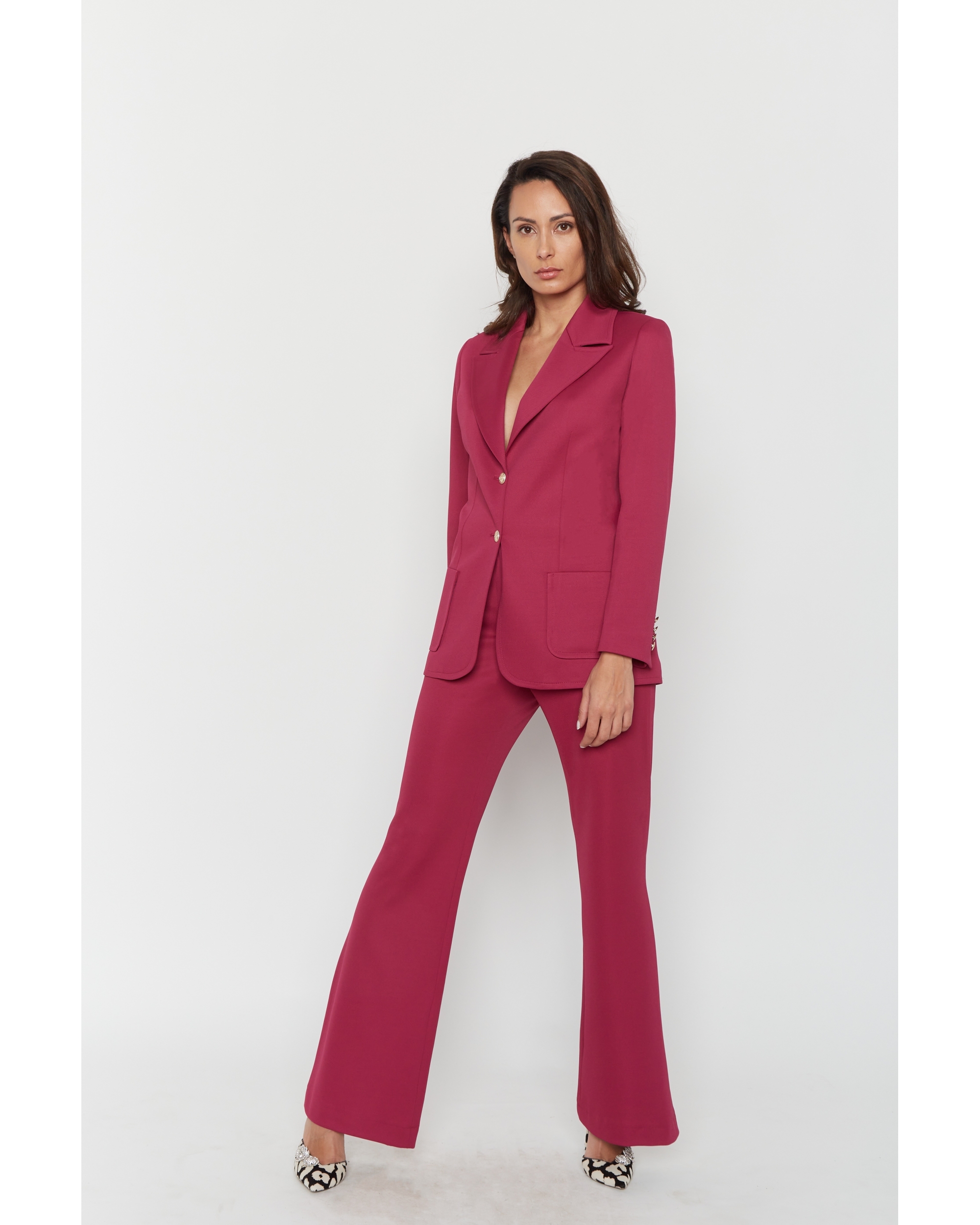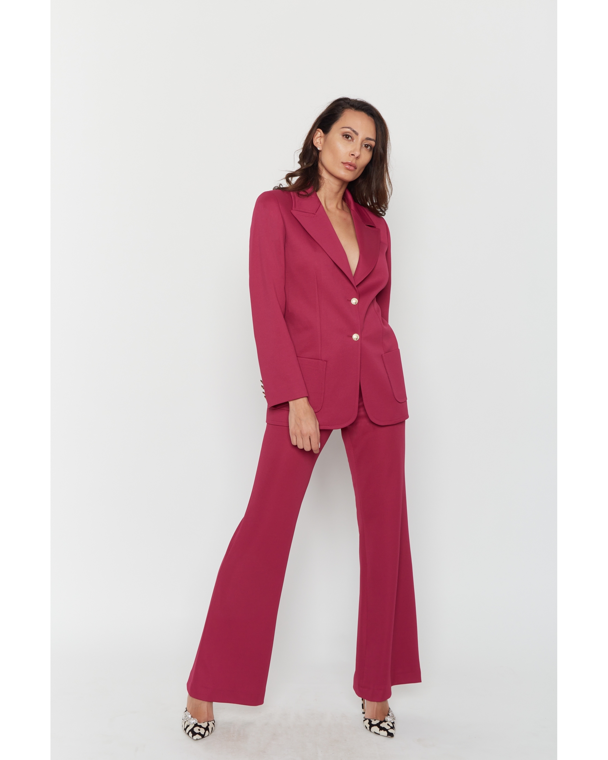 Ensemble composé de la veste Rachel à large col inspirées des seventies,2 poches plaquées,boutons dorés.Le Pantalon Vanessa est  taille haute et jambes larges.