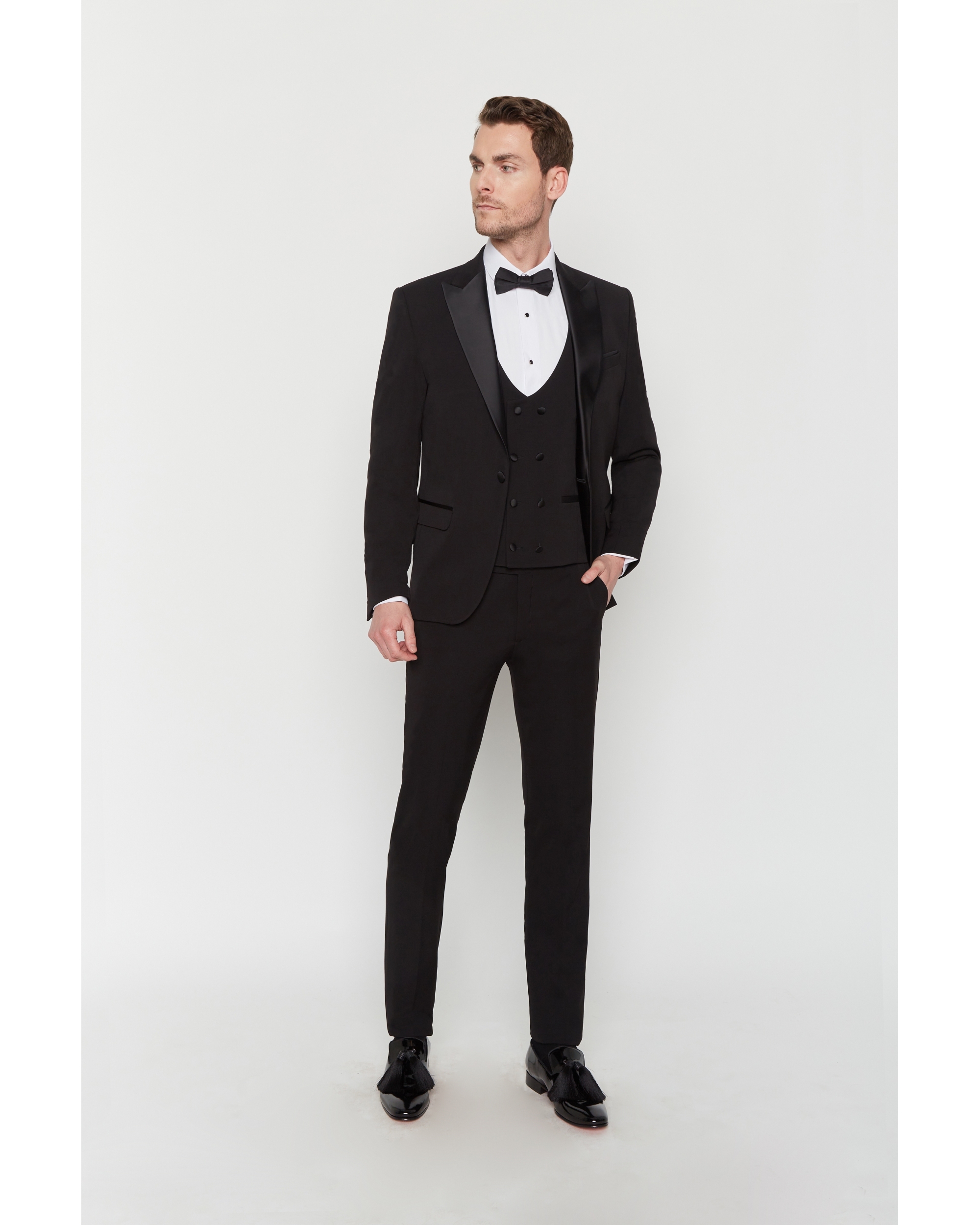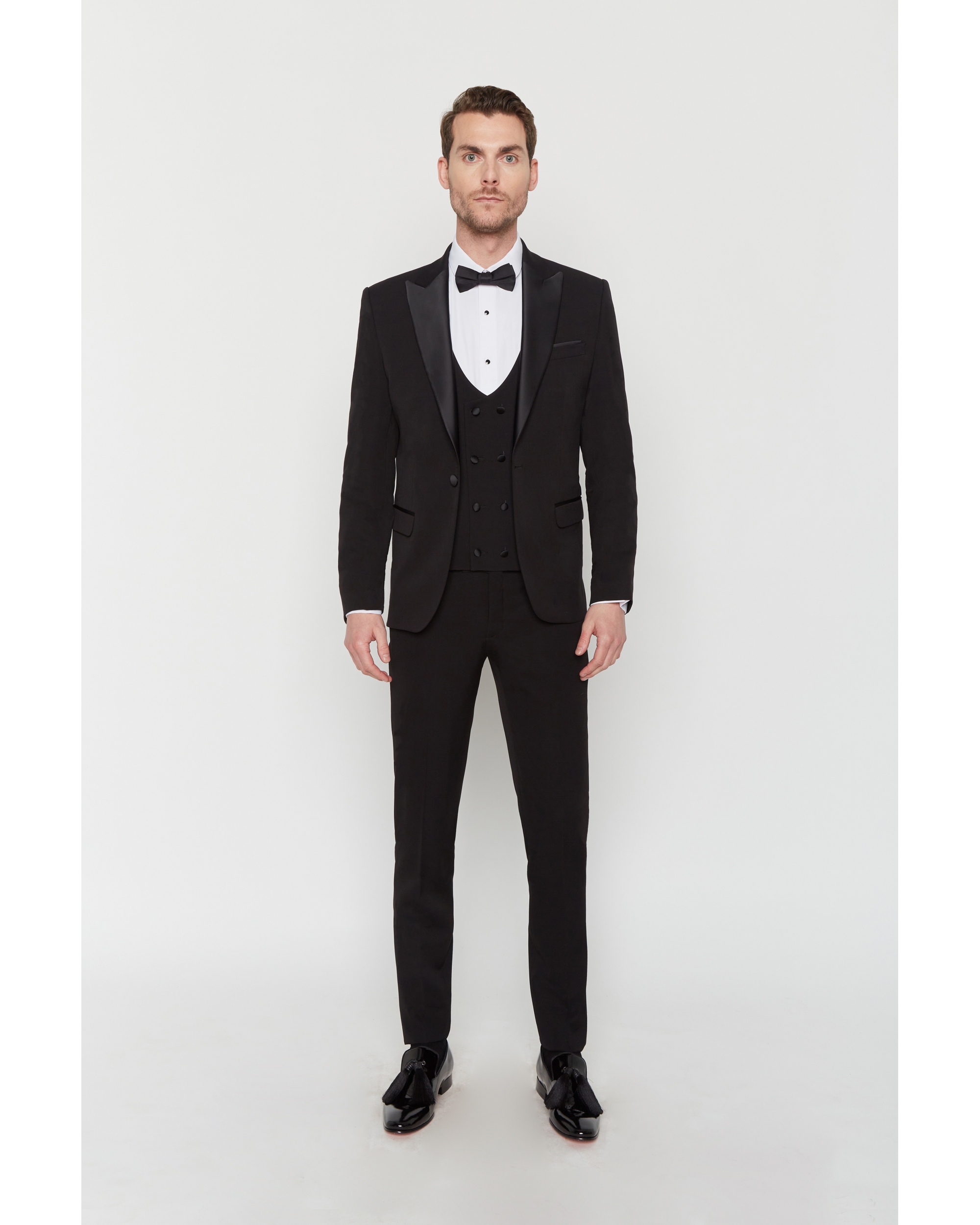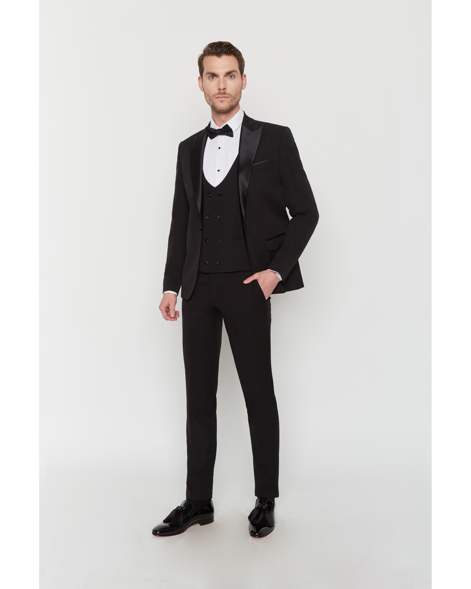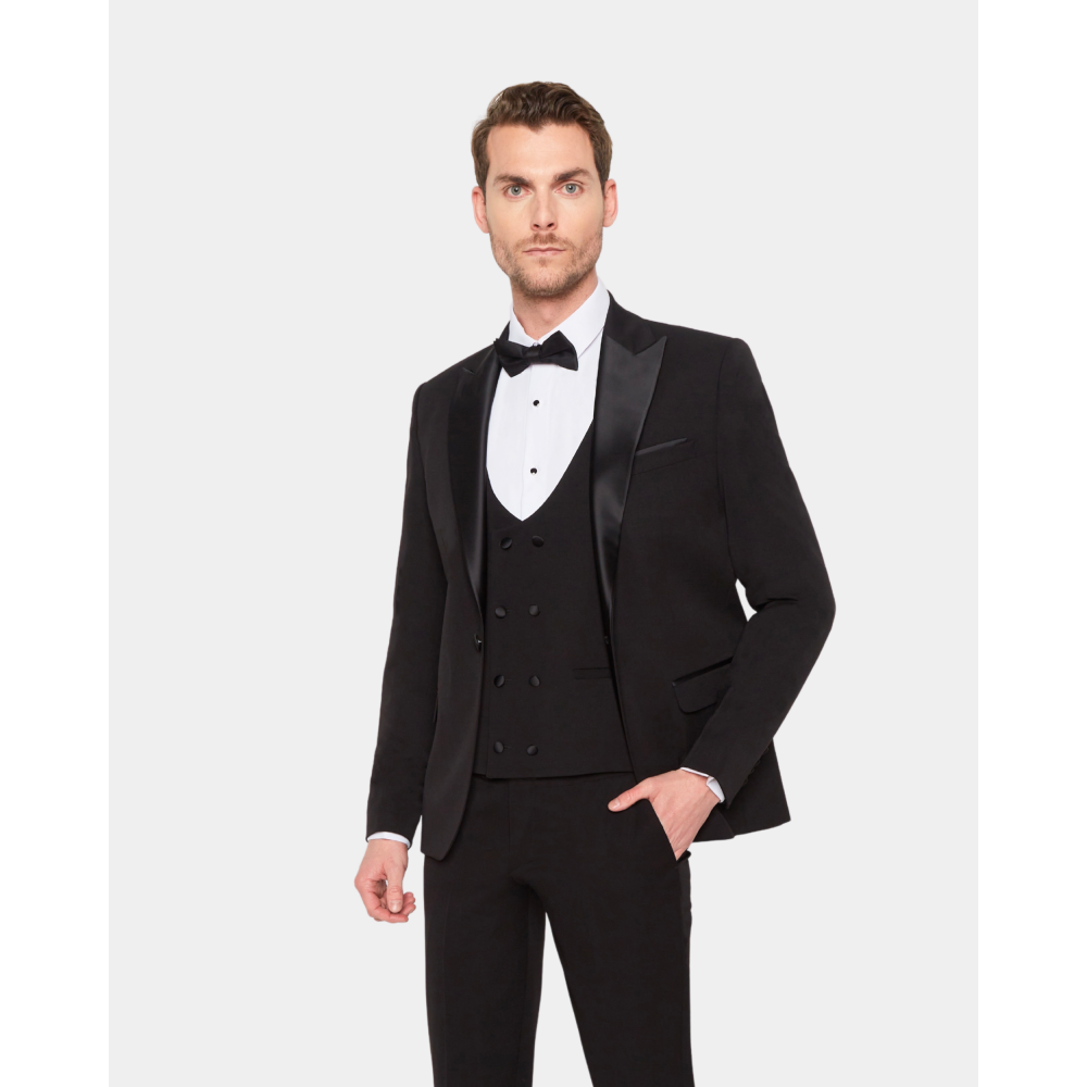 Ce smoking en laine mélangé comporte du Lycra pour un confort optimum. Avec une coupe ajustée cet ensemble se compose d’une veste à col pointe en satin 2 poches rabat et d’un pantalon zippé à 2 poches italienne.