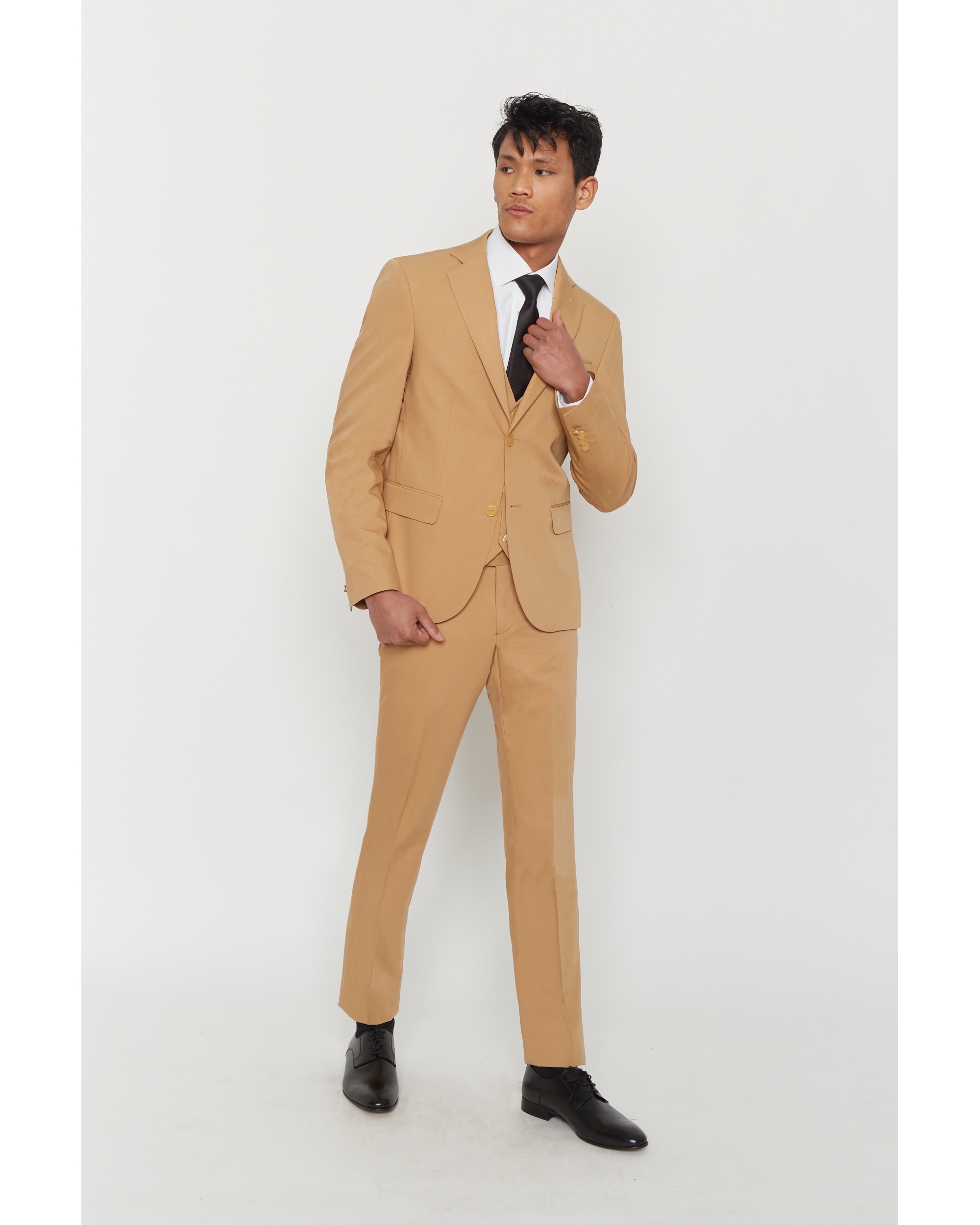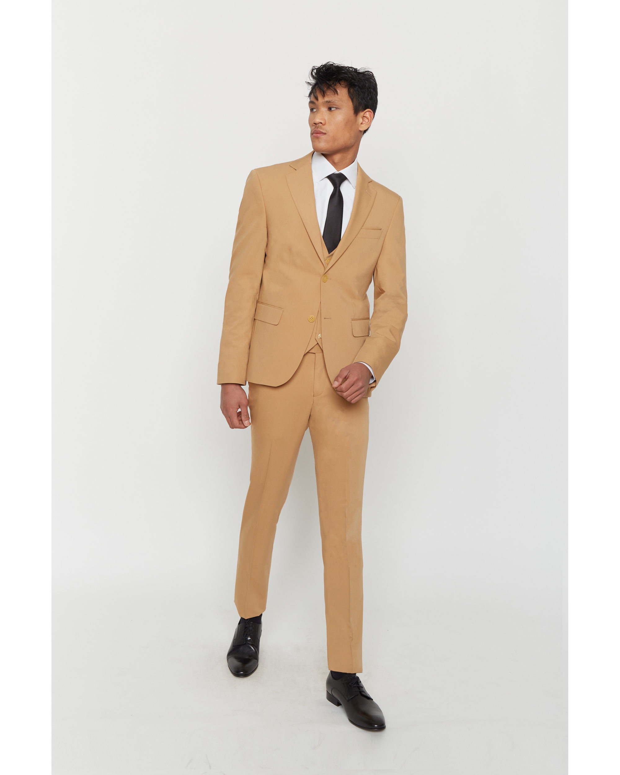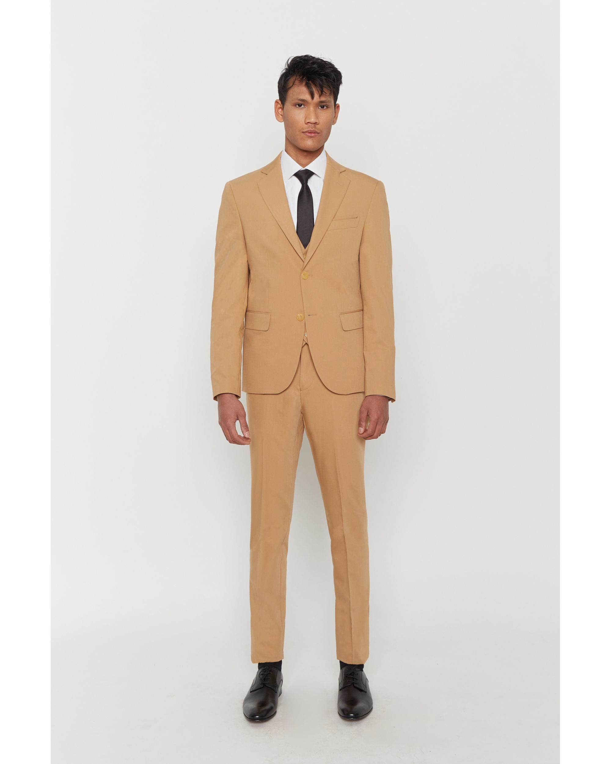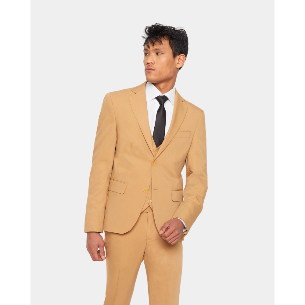 Ce costume en laine mélangée est relativement leger pour un confort optimum. Avec une coupe ajustée, cet ensemble se compose d’une veste à col cranté aux 2 poches rabat sur le devant, d’un pantalon zippé poche italienne et de son gilet assorti