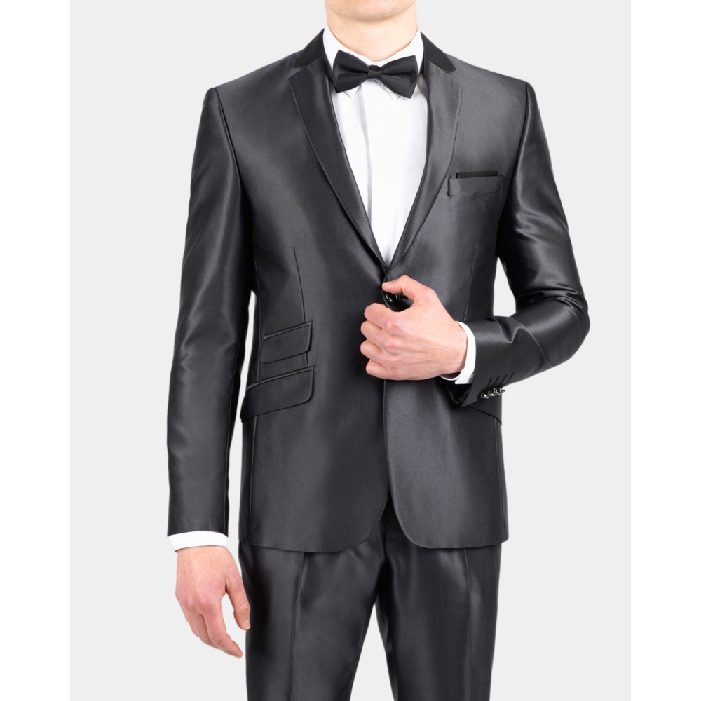 Ce smoking en tissu brillant est ideal pour les fetes. Avec une coupe ajustée cet ensemble se compose d’une veste à col cranté en satin 3 poches à rabat , et d’un pantalon zippé à poches italienne.