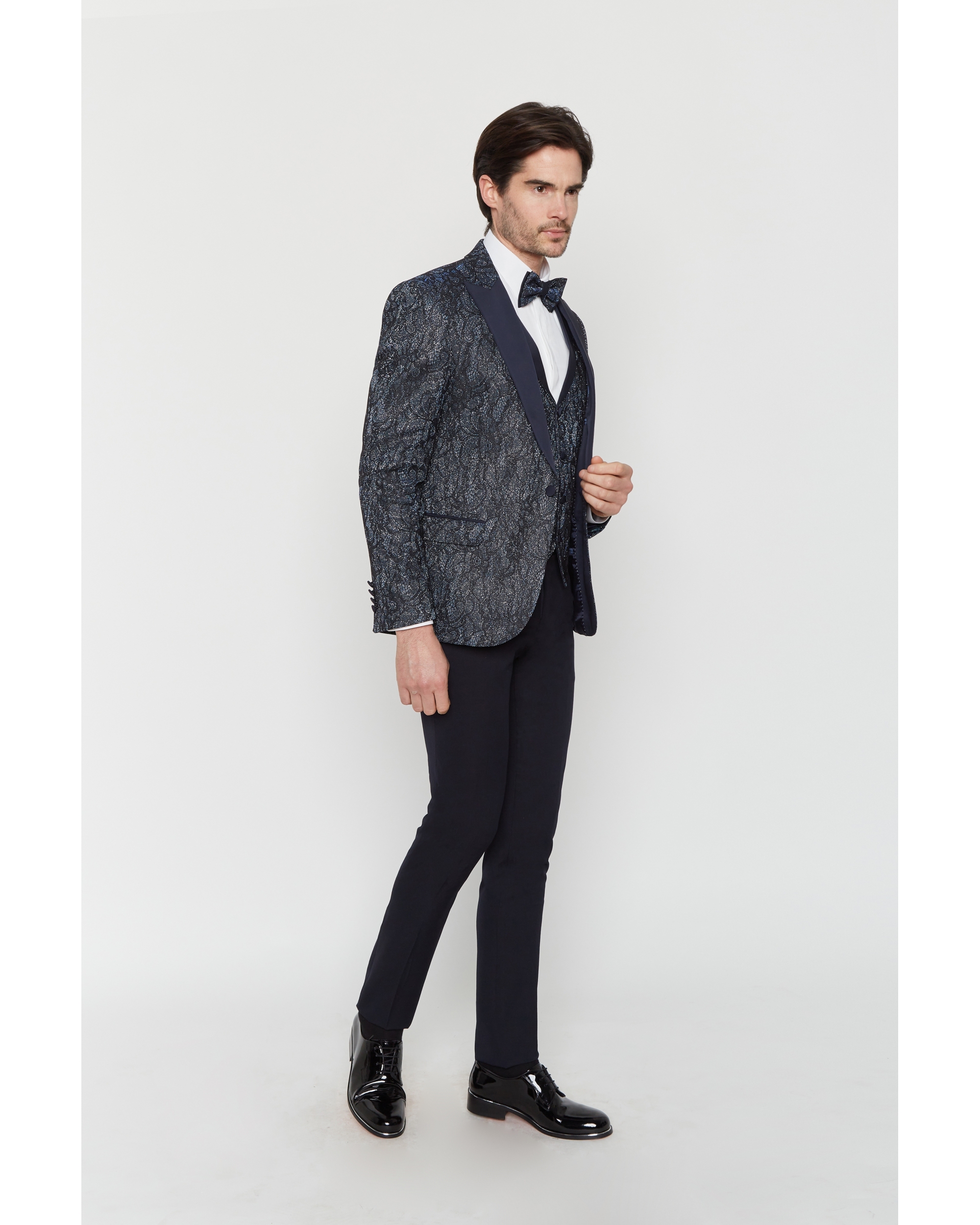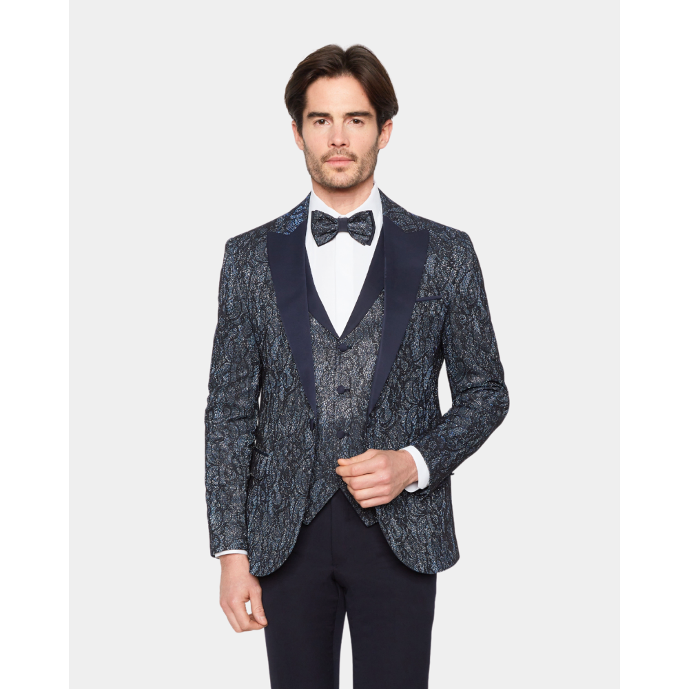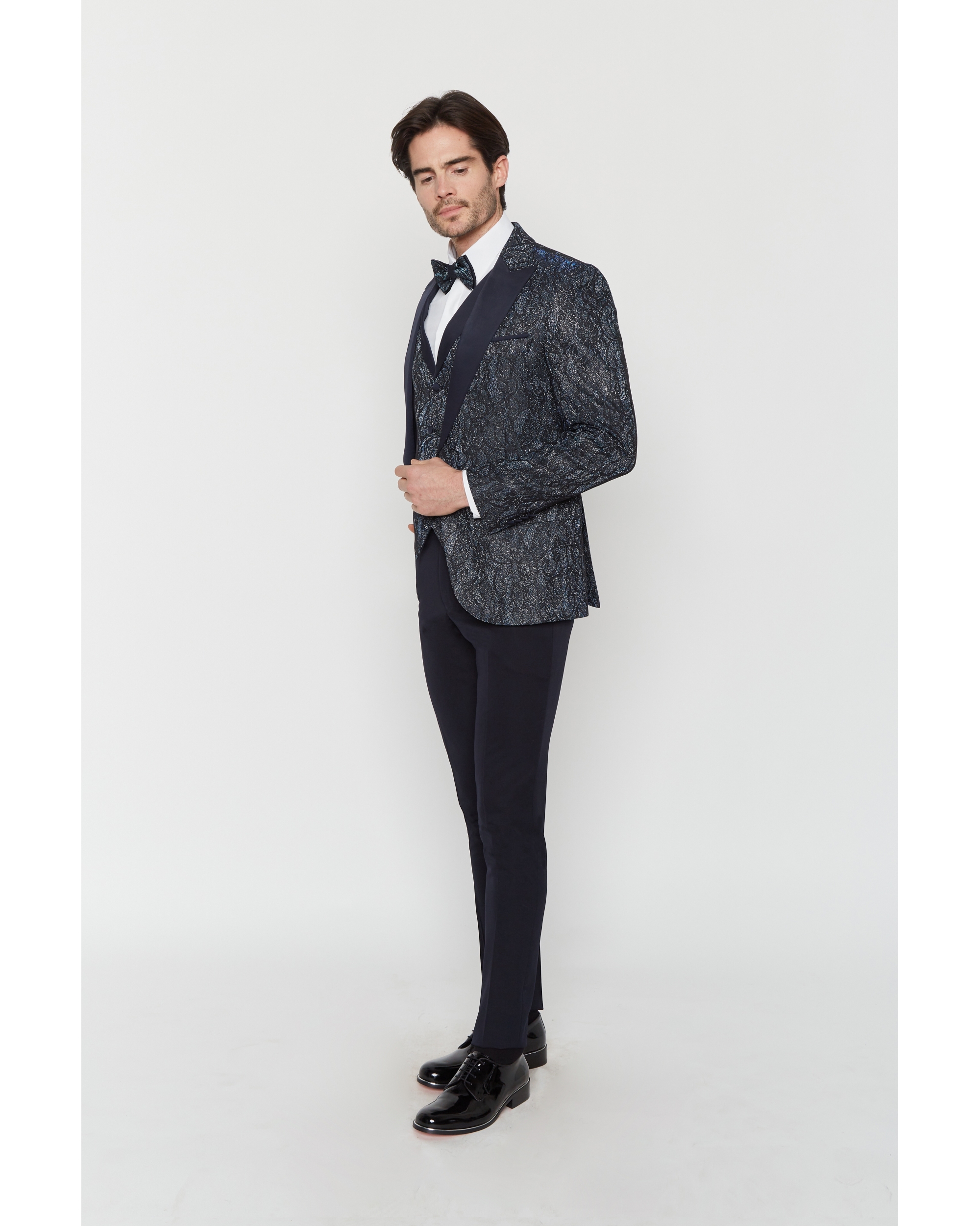 Smoking changeant et extravagant,coupe slim.Veste col pointe avec gilet et noeud papillon assorti,pantalon noir