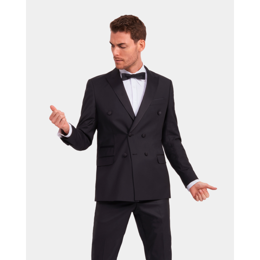 Smoking croise col satin,coupe ajustée.Tissu en laine melangée avec du lycra,tres agreable a porter