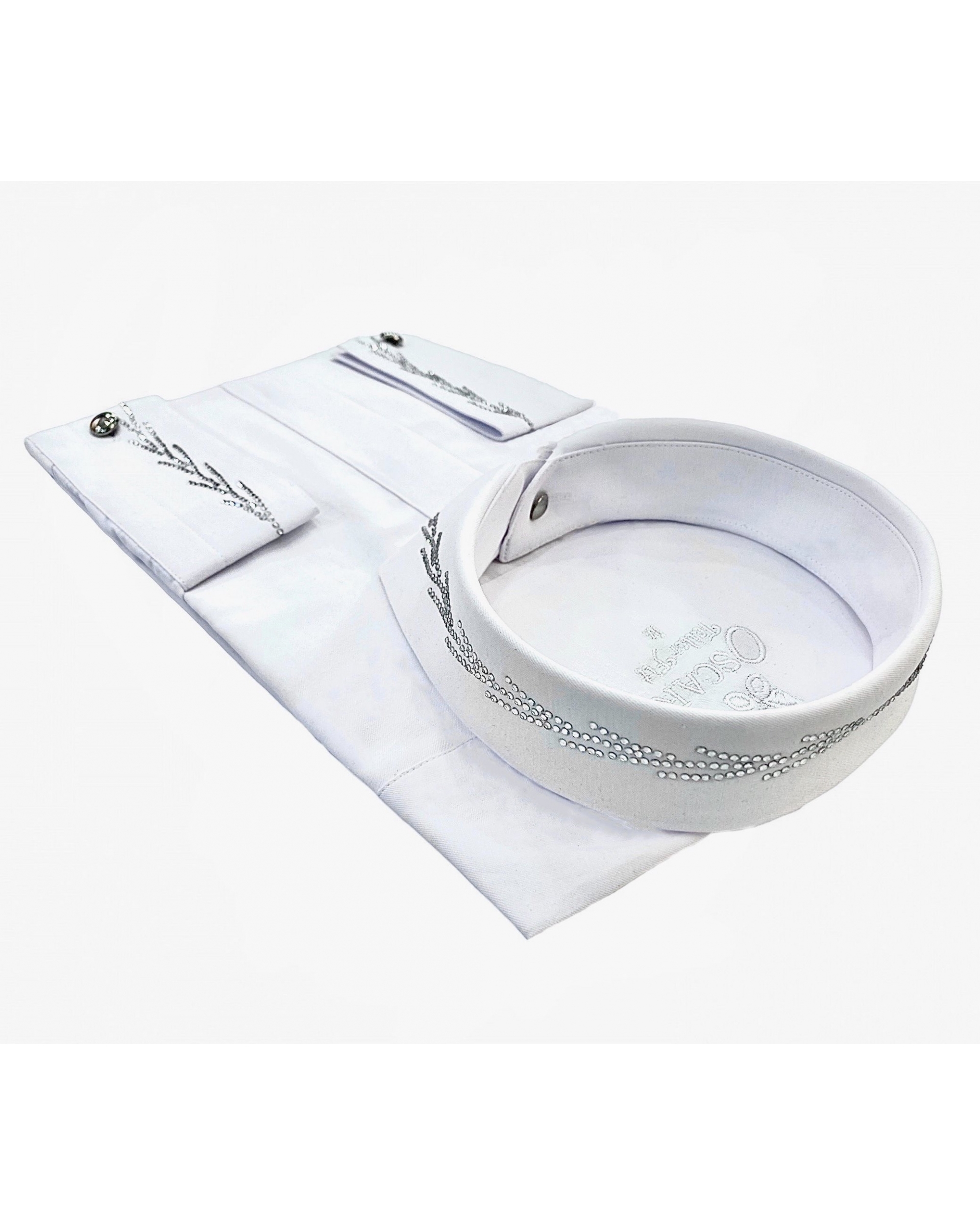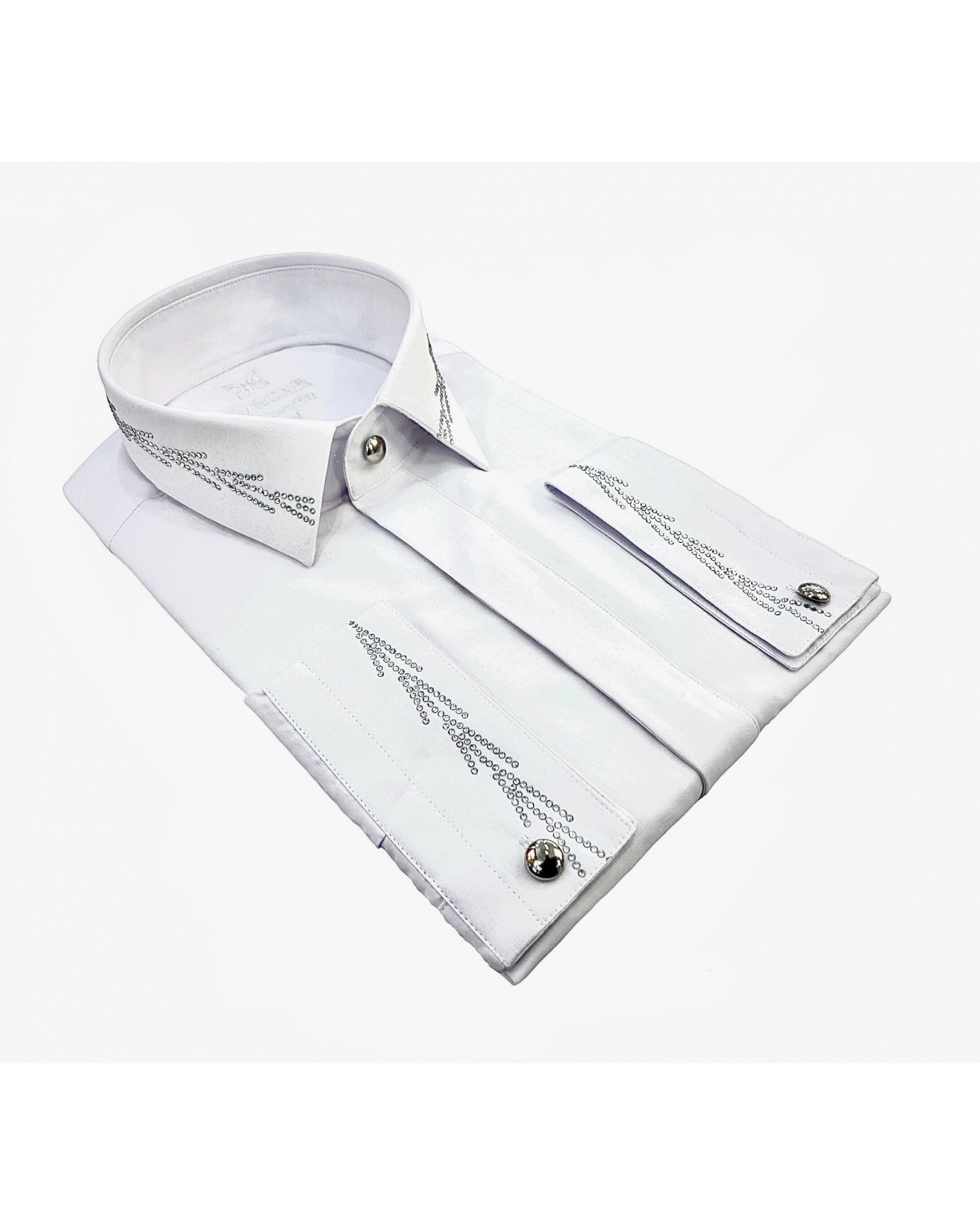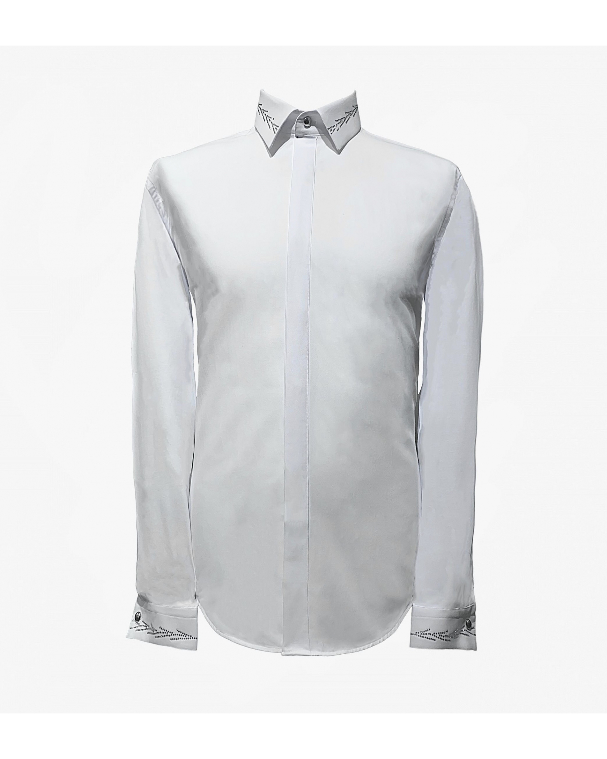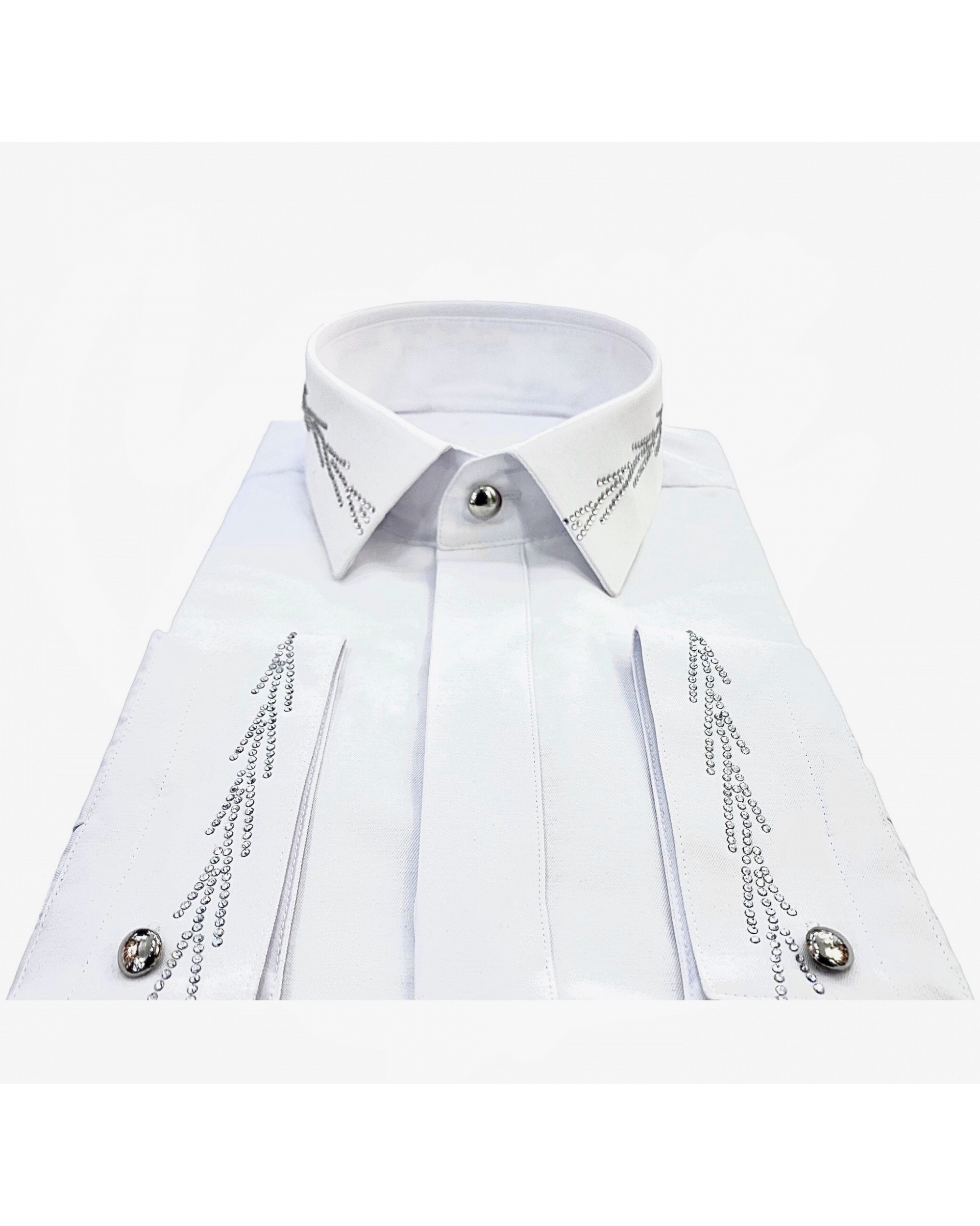 Cette chemise fabriquée dans un tissu "facile à repasser" vous donnera une élégance et un confort pour toute vos grandes occasions. Chemise col français sans couture apparente avec strass au col et au poignet avec bouton métal amovible . Patte de boutonnage cachée.