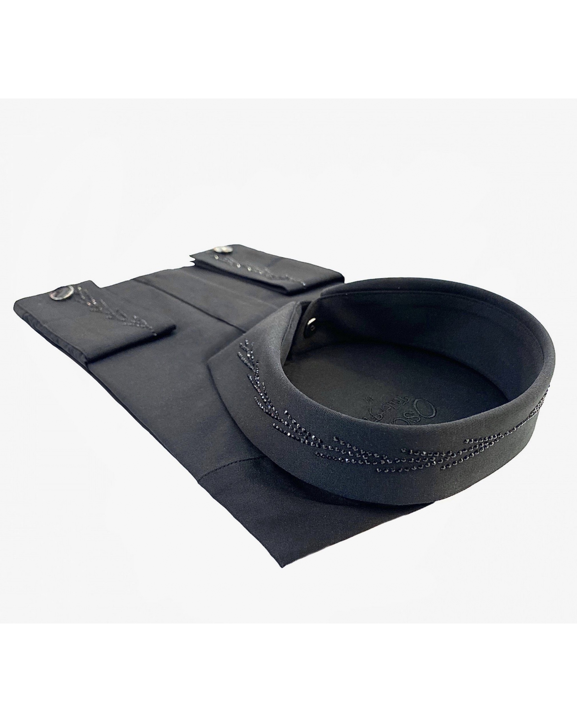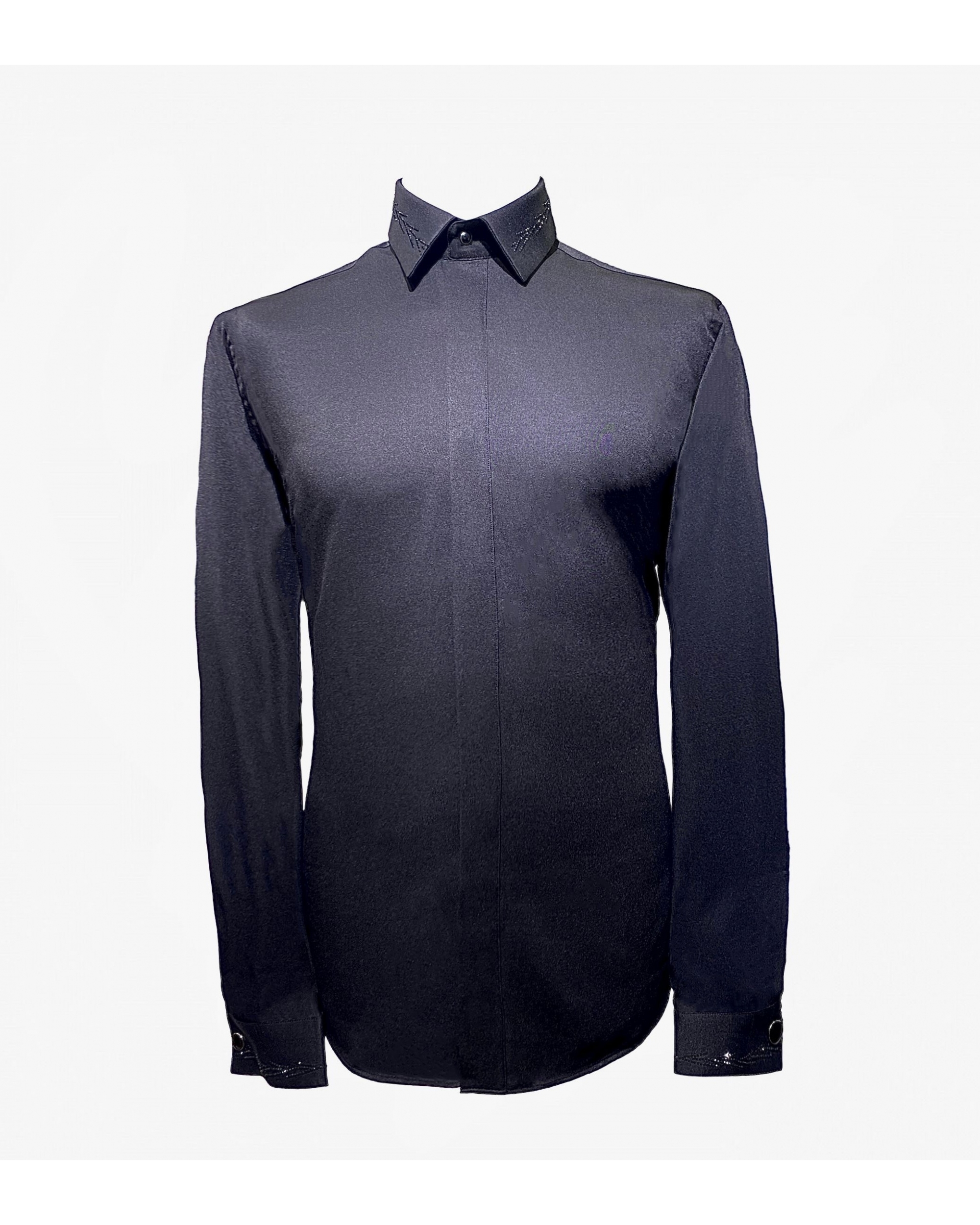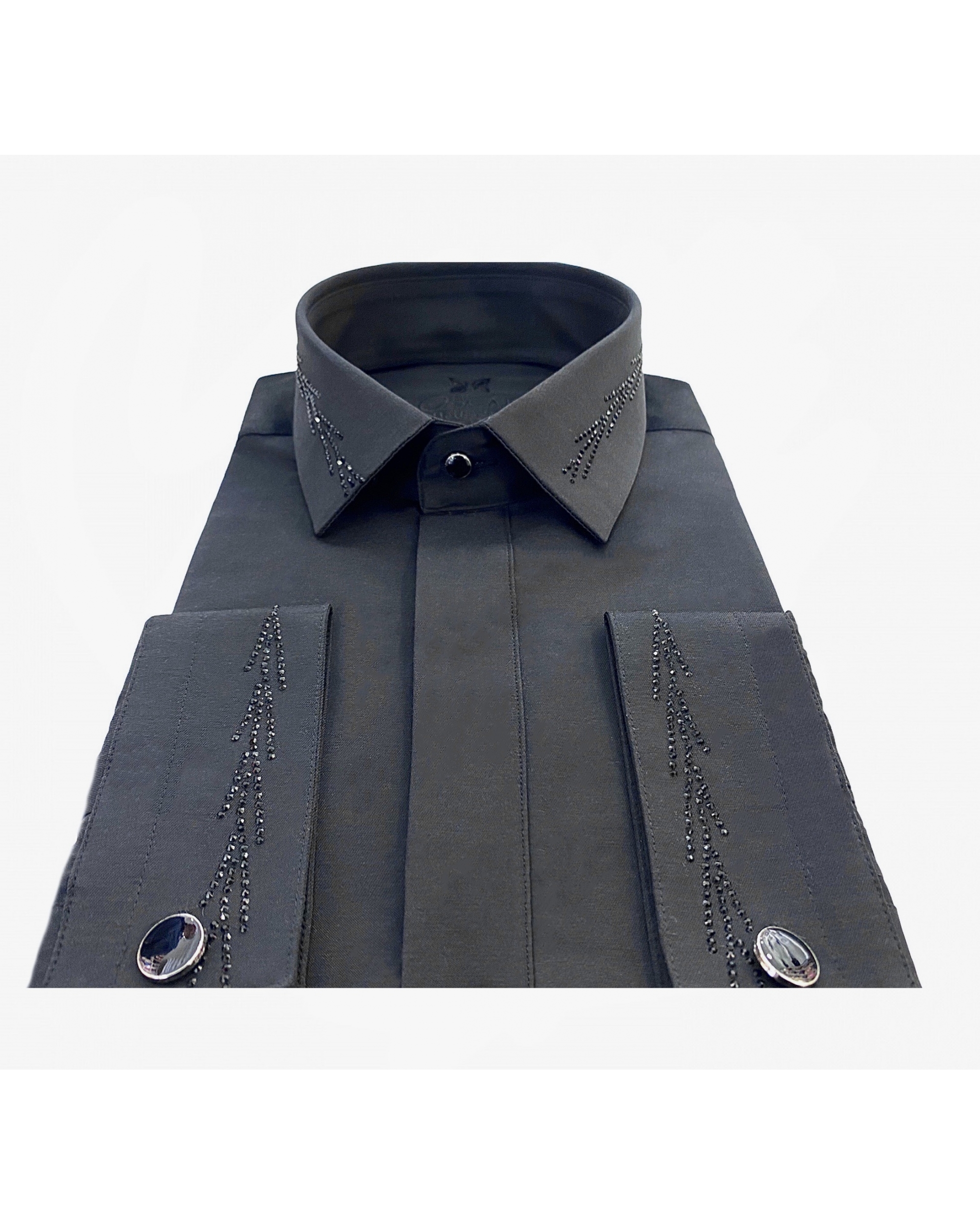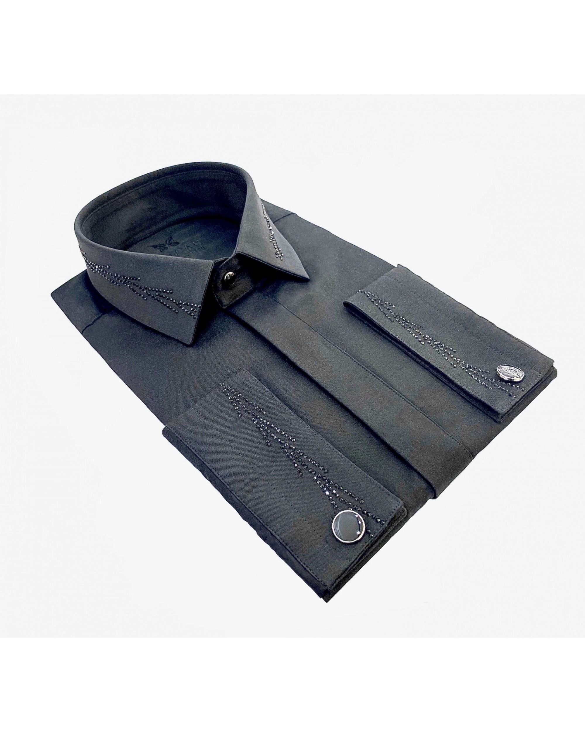 Cette chemise fabriquée dans un tissu "facile à repasser" vous donnera une élégance et un confort pour toute vos grandes occasions. Chemise col français sans couture apparente avec strass au col et au poignet avec bouton métal amovible . Patte de boutonnage cachée.